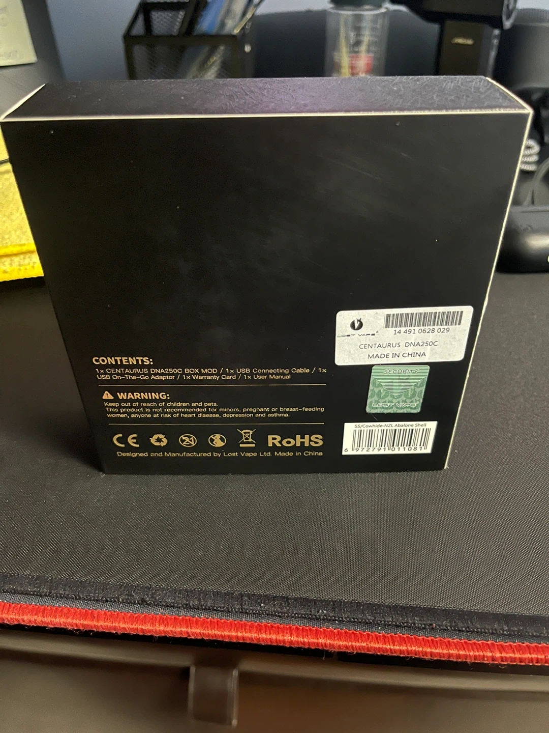 This is the Lost Vape Centaurus DNA 250C mod. It comes with the original box, a USB connecting cable, It's designed and manufactured by Lost Vape Ltd.