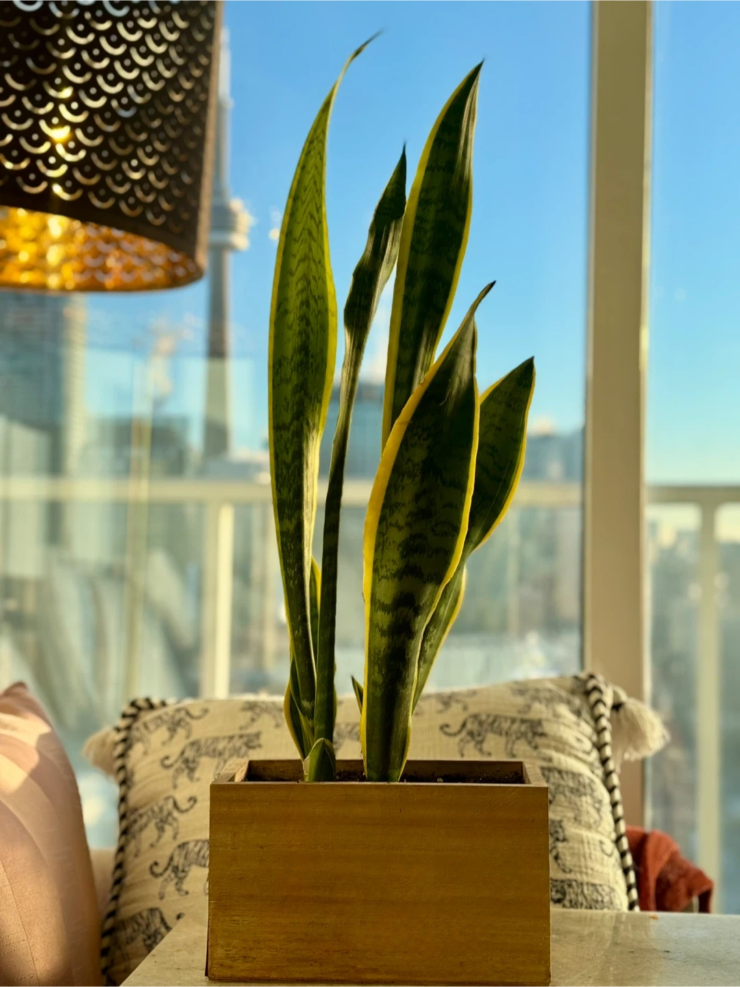 Beautiful, healthy snake plant (Sansevieria) with tall, sculptural leaves—perfect for modern condos and minimalist interiors.