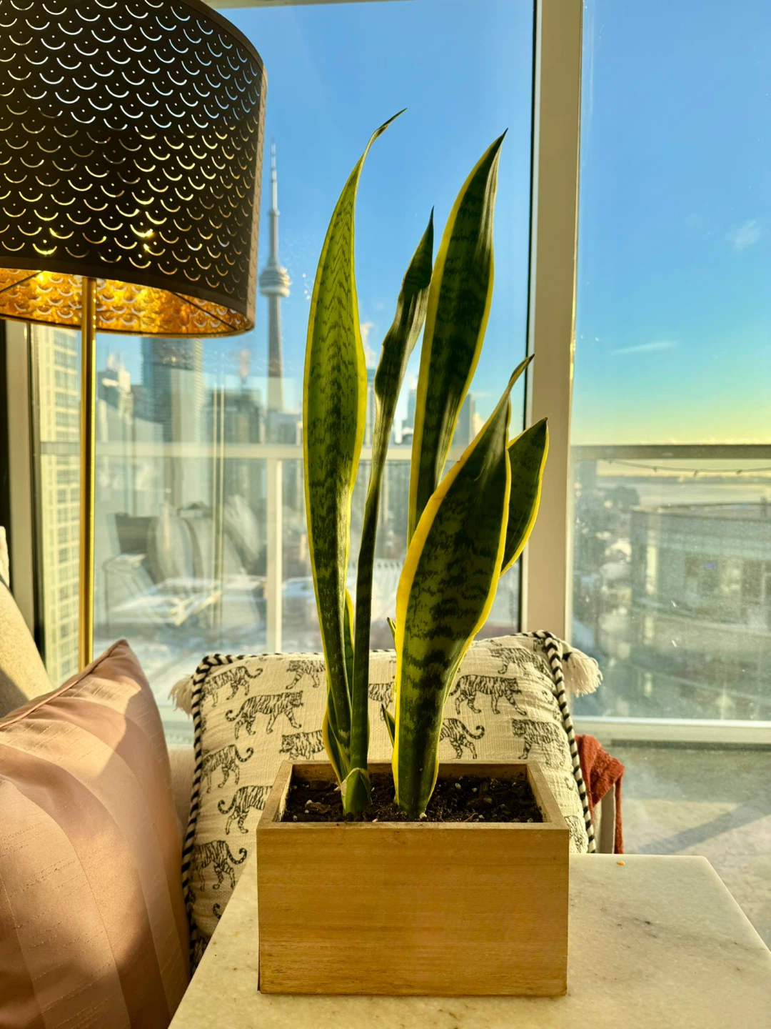 Beautiful, healthy snake plant (Sansevieria) with tall, sculptural leaves—perfect for modern condos and minimalist interiors.