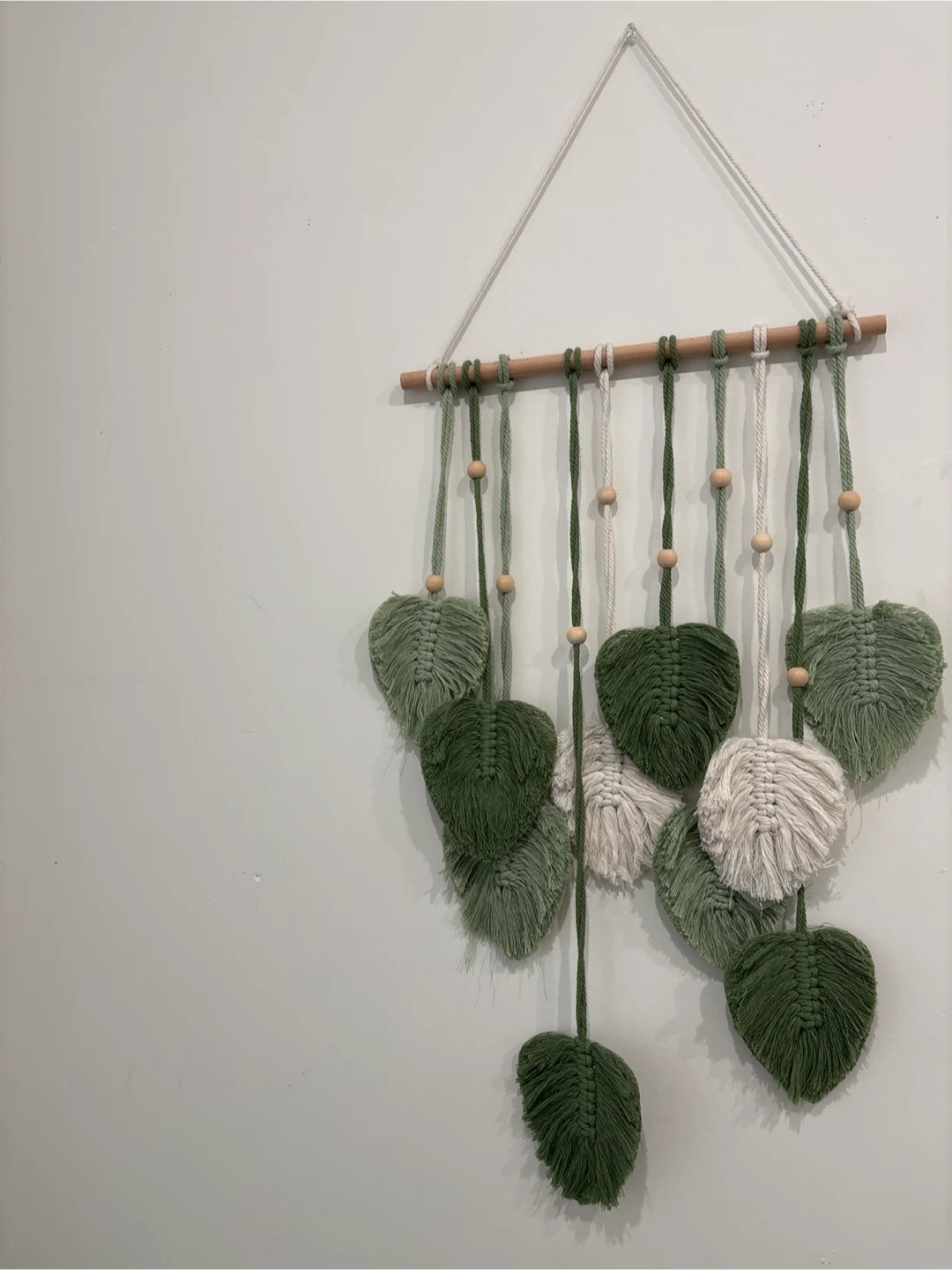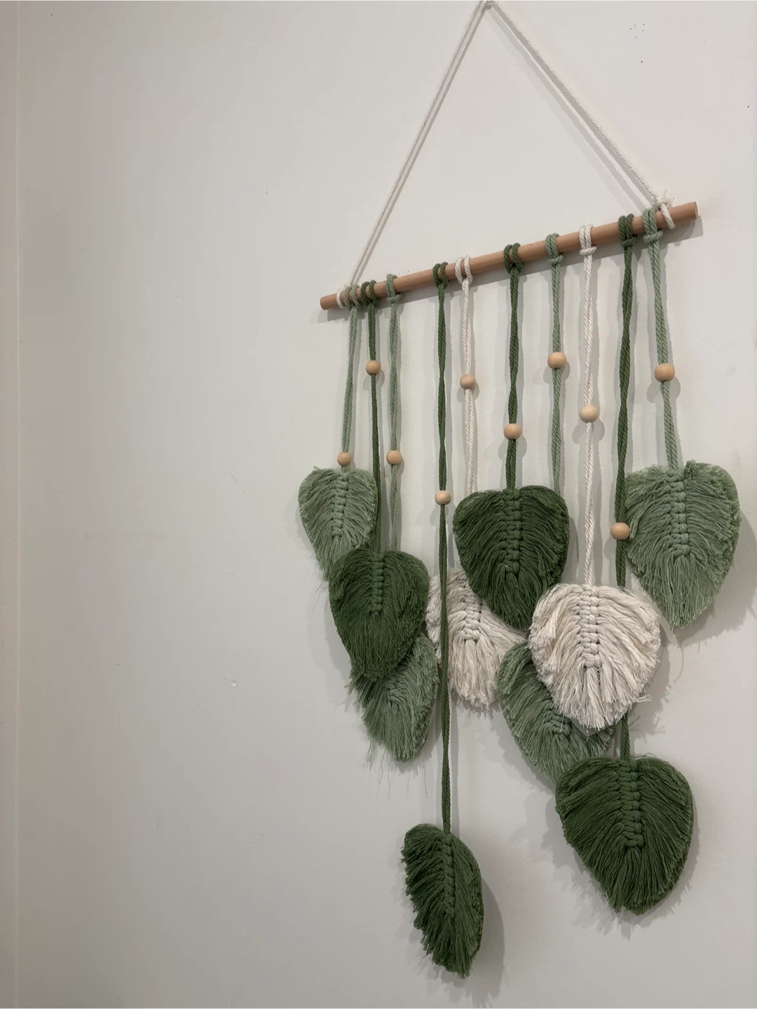 Handmade macrame wall hanging featuring green and cream leaf shapes, accented with wooden beads. It's strung on a natural wood dowel. Adds a boho touch to any room!
