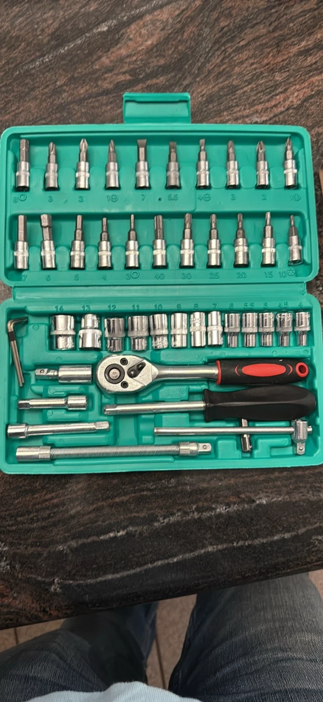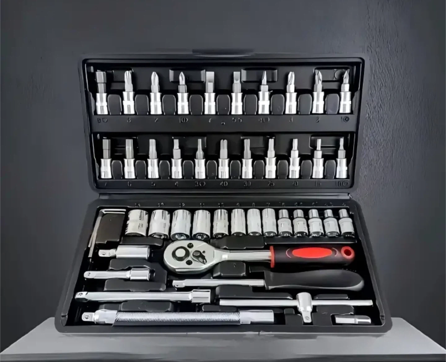 This is a 46-piece tool set for home and auto use. It includes sockets, a ratchet handle, screwdriver bits, and various adaptors. Everything comes in a convenient blow-molded case.