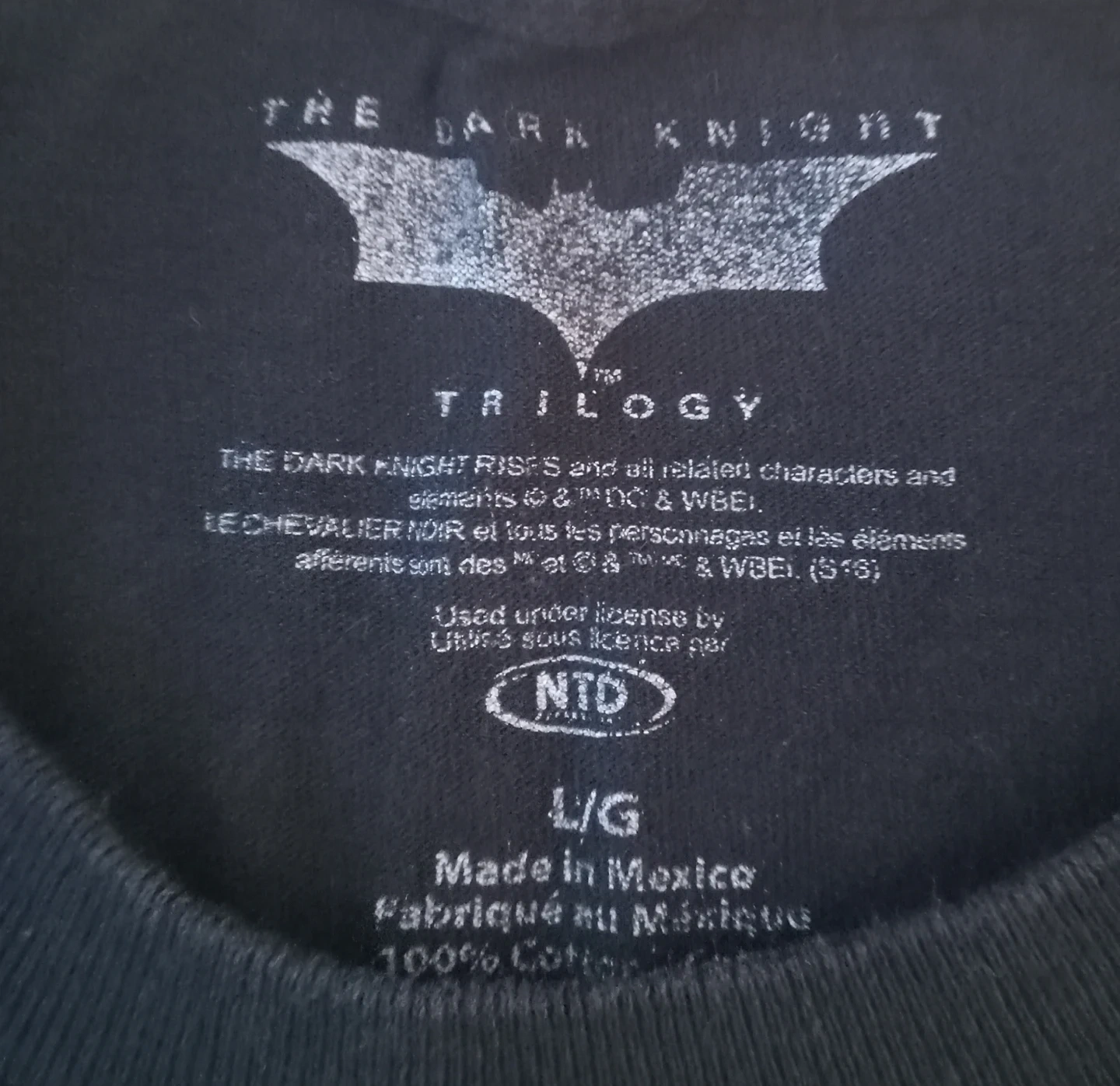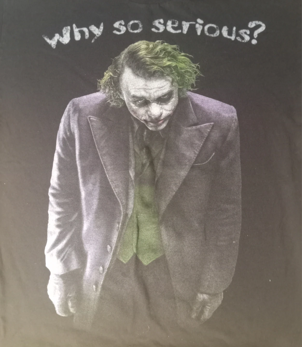 Black t-shirt featuring The Joker from The Dark Knight movie. Says "Why so serious?" on the front. It's size Large and made of 100% cotton. Made in Mexico.