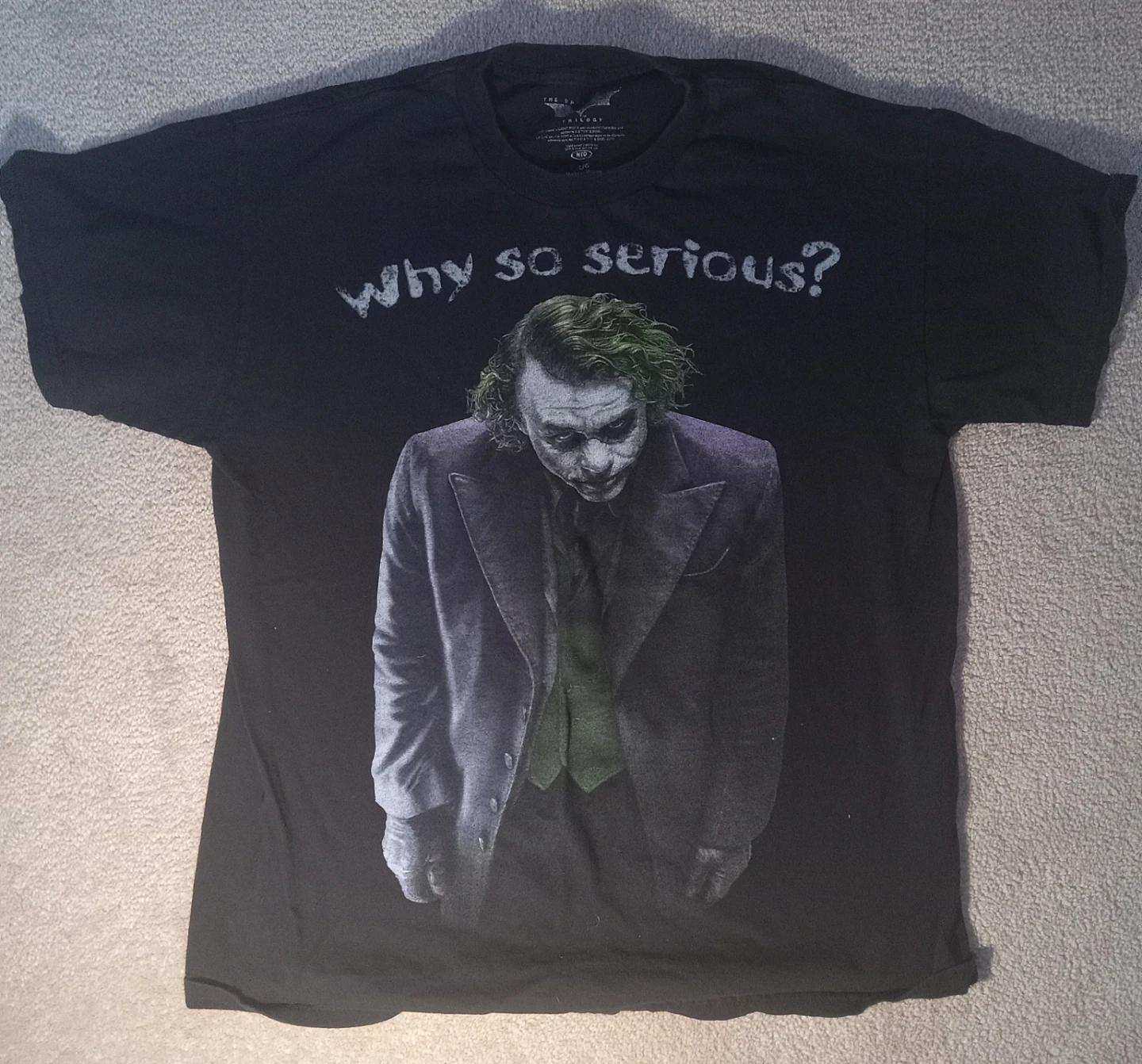 Black t-shirt featuring The Joker from The Dark Knight movie. Says "Why so serious?" on the front. It's size Large and made of 100% cotton. Made in Mexico.