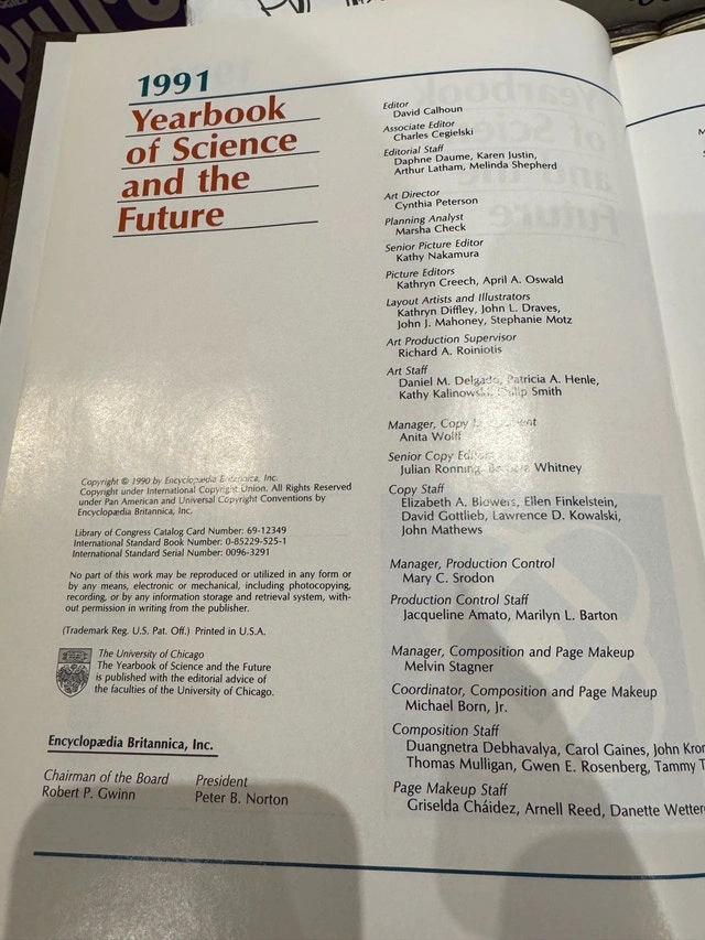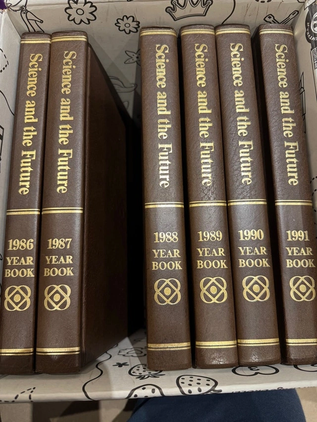 Encyclopedia Britannica Macropaedia 15th Edition, Yearbook of Science and the Future 1986-1991, and Medical and Health Annual 1985-1991.