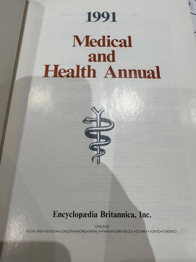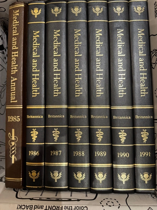 Encyclopedia Britannica Macropaedia 15th Edition, Yearbook of Science and the Future 1986-1991, and Medical and Health Annual 1985-1991.