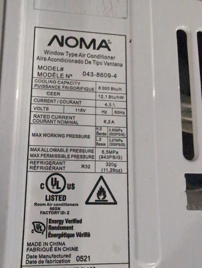 Selling a NOMA window type air conditioner, model number 043-8609-4. It has a cooling capacity of 6000 BTU/h and uses refrigerant R32. It's in good working condition and ready to keep you cool!