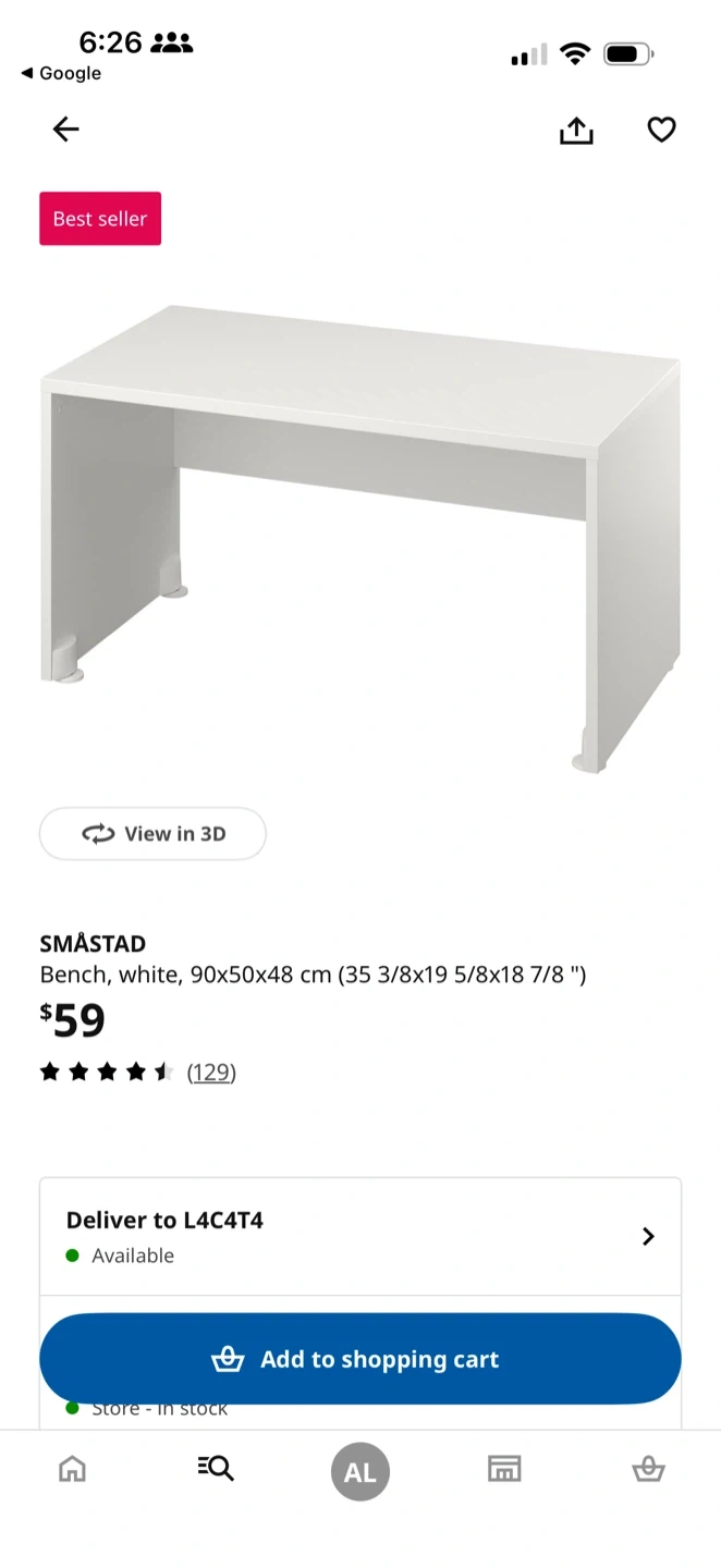 White IKEA SMÅSTAD bench. Its dimensions are 90x50x48 cm. This bench is a versatile piece for any room.