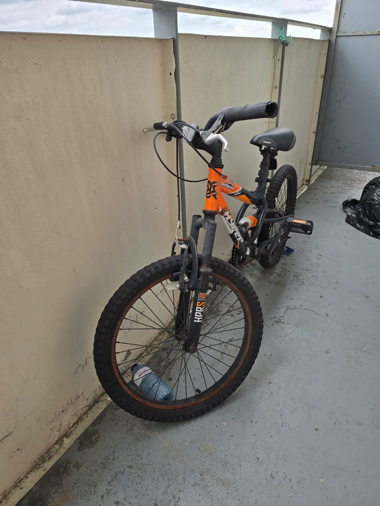 Selling a used Hyper Bear Mountain bike for kids. It's in good condition and ready for some fun rides! The bike is orange and black. Perfect for kids who are learning to ride or want to explore trails