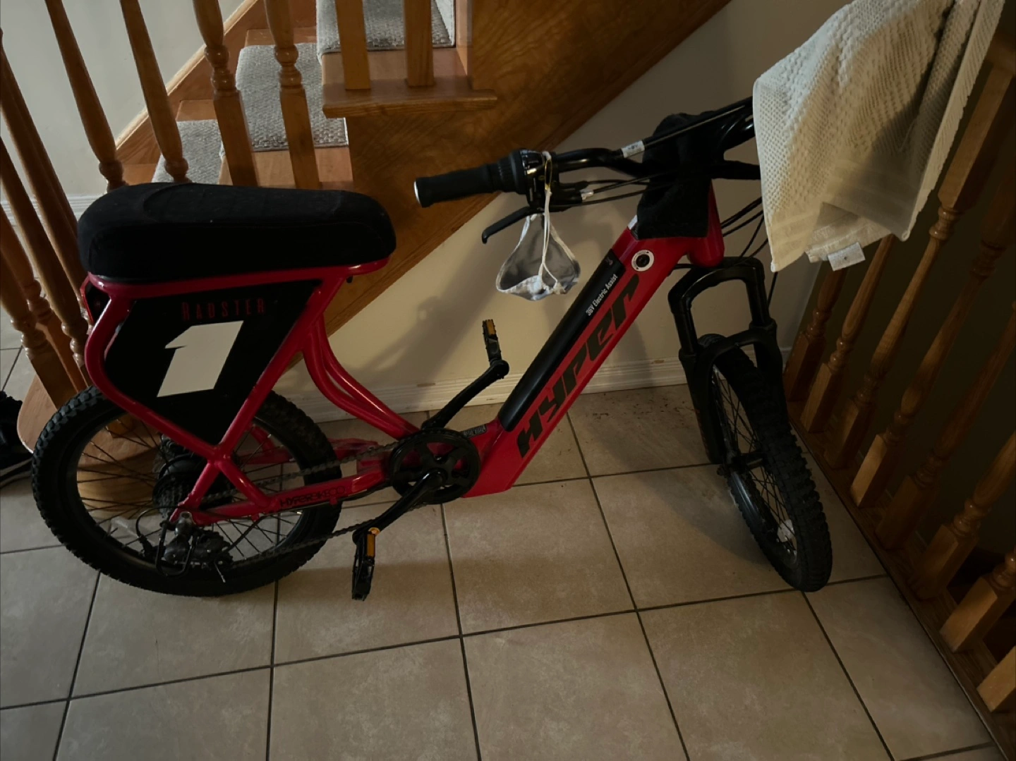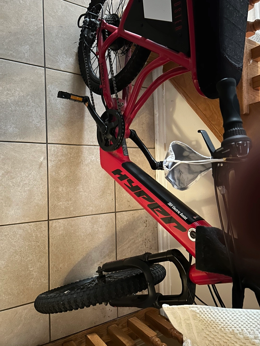 55Electric bike with a red frame. It has black tires and a black seat. It features a black handlebar and a battery compartment. A great way to enjoy the outdoors.