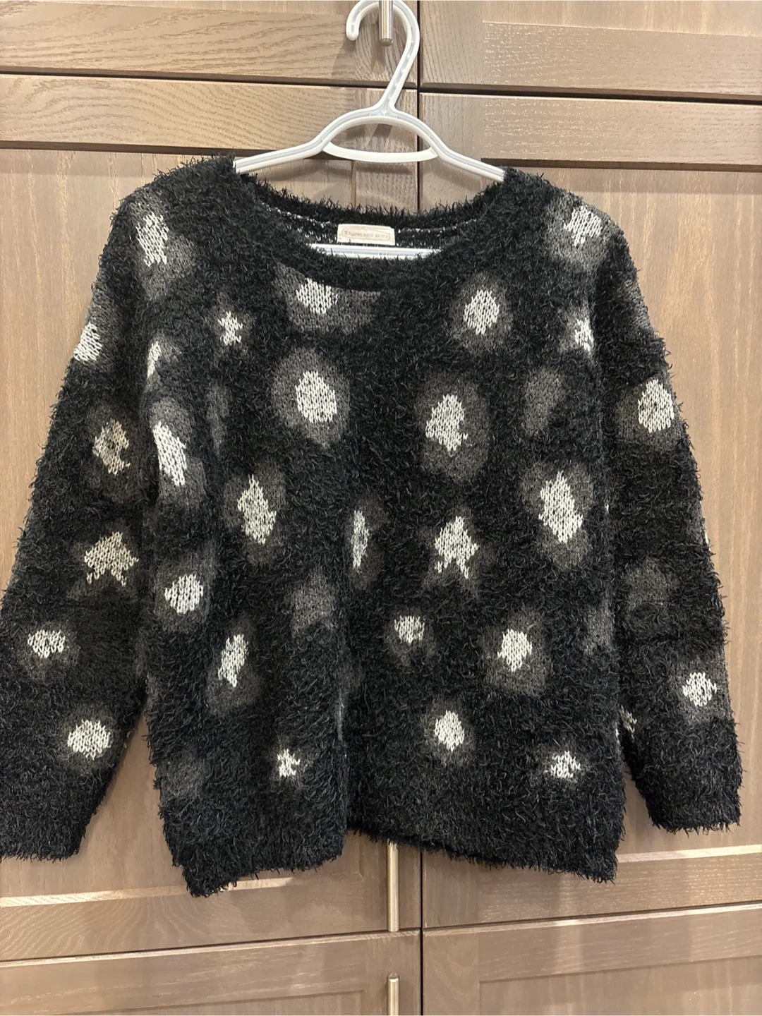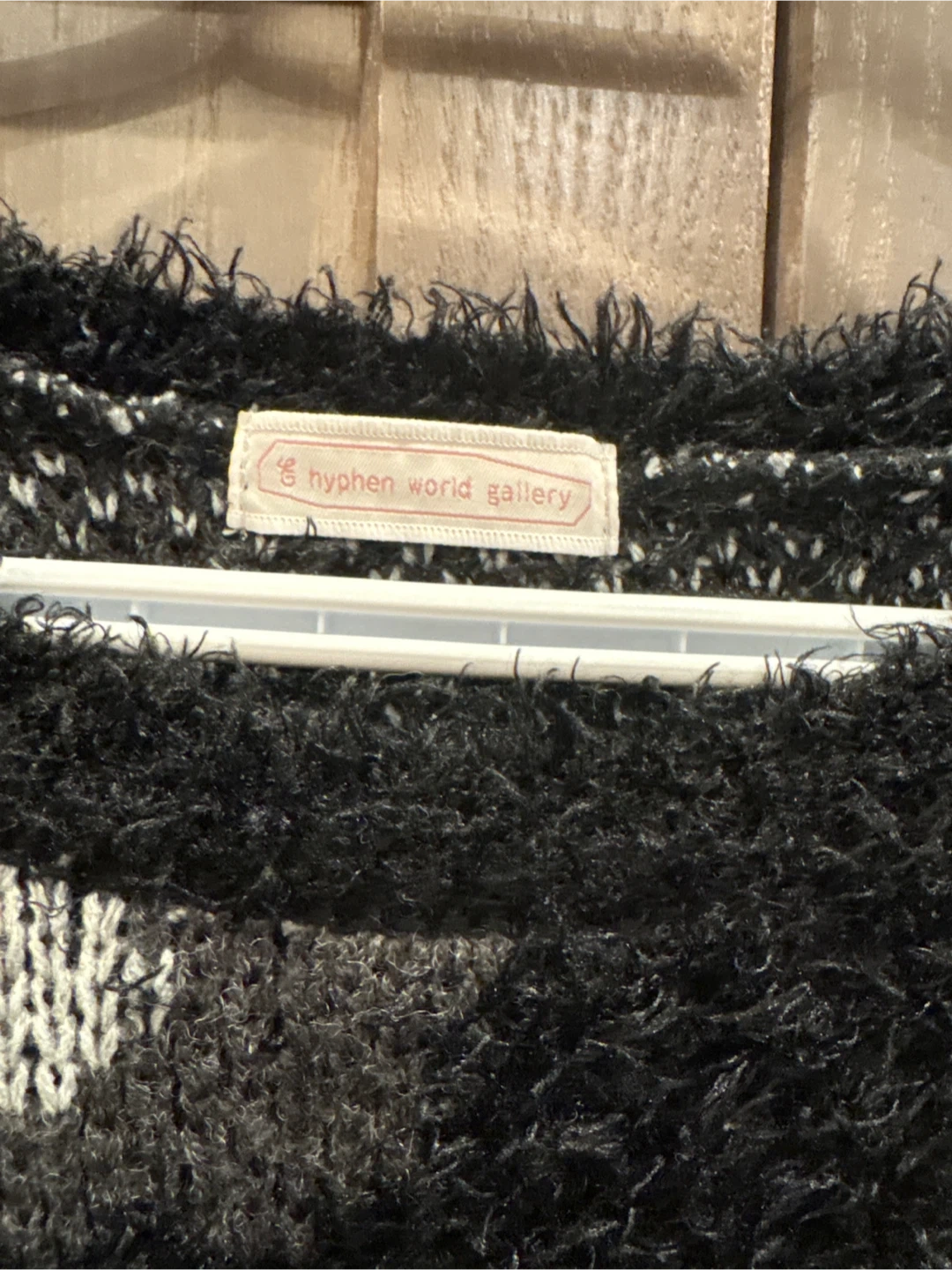 20cozy sweater from Hyphen World Gallery! It features a fuzzy texture and a unique pattern in black and white. Perfect for staying warm and stylish during the colder months!