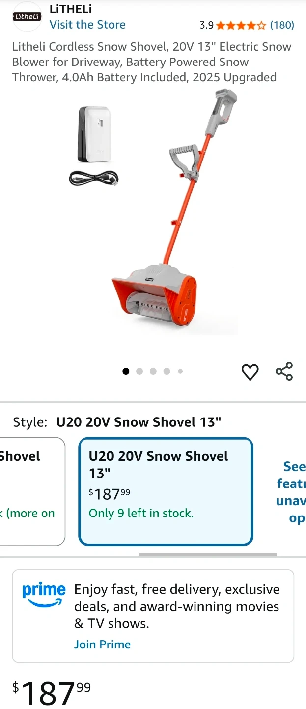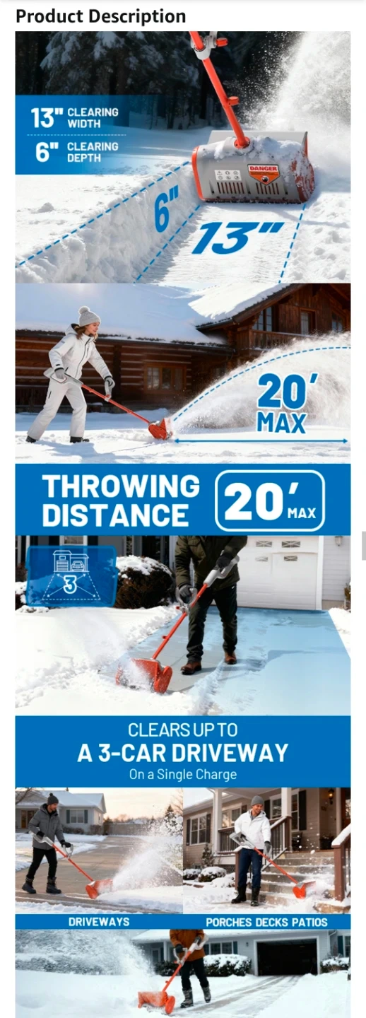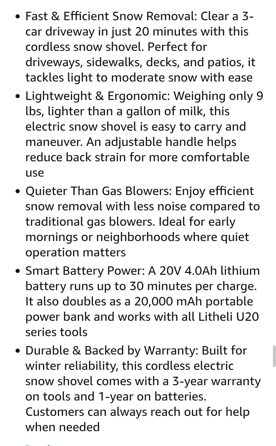 I am selling a Litheli cordless snow shovel, a 20V 13" electric snow blower perfect for clearing driveways. It’s battery powered with an included 4.0Ah battery and is the upgraded 2025 model. This lightweight and ergonomic snow shovel weighs only 9 lbs and has an adjustable handle to reduce back strain. It's also quieter than gas blowers, making it ideal for early mornings.
