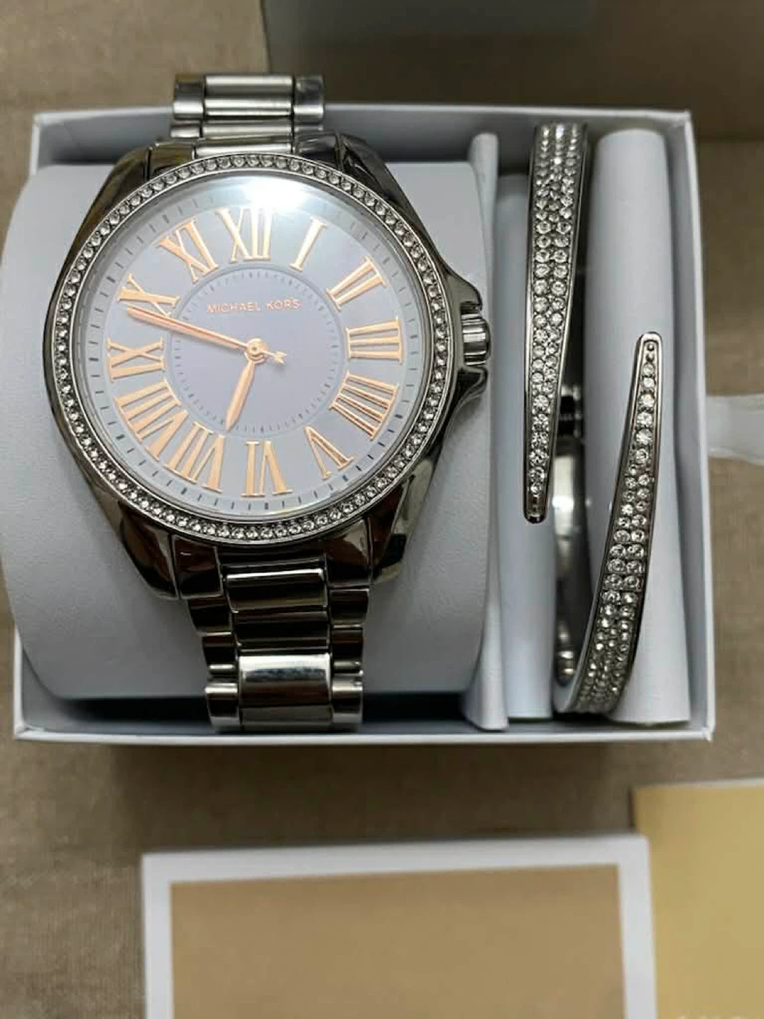 This is a Michael Kors watch and bracelet set. The watch has a stainless steel band and features Roman numerals on its white face. Two sparkling bracelets are included.