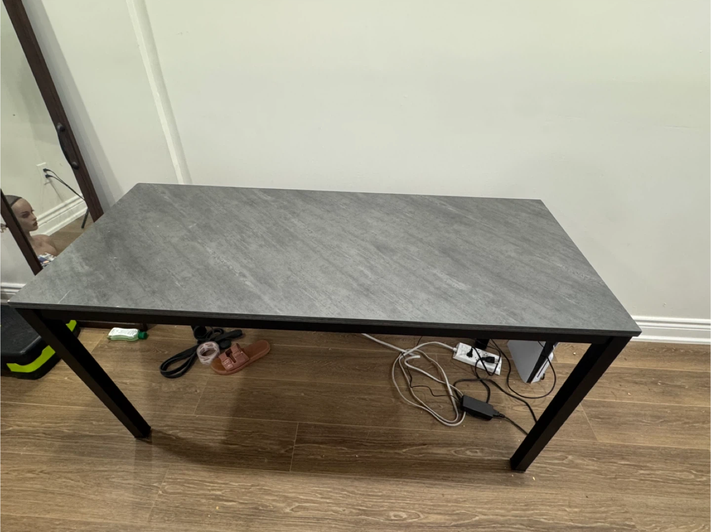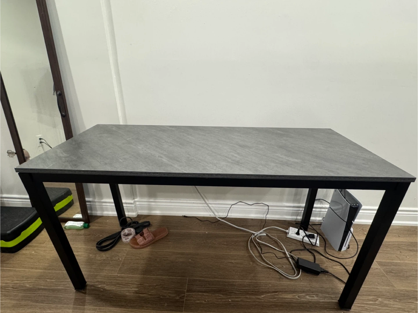 This desk has a grey marble-look laminate top and black metal legs. It's a good size for a workspace. Perfect for a home office or study area!