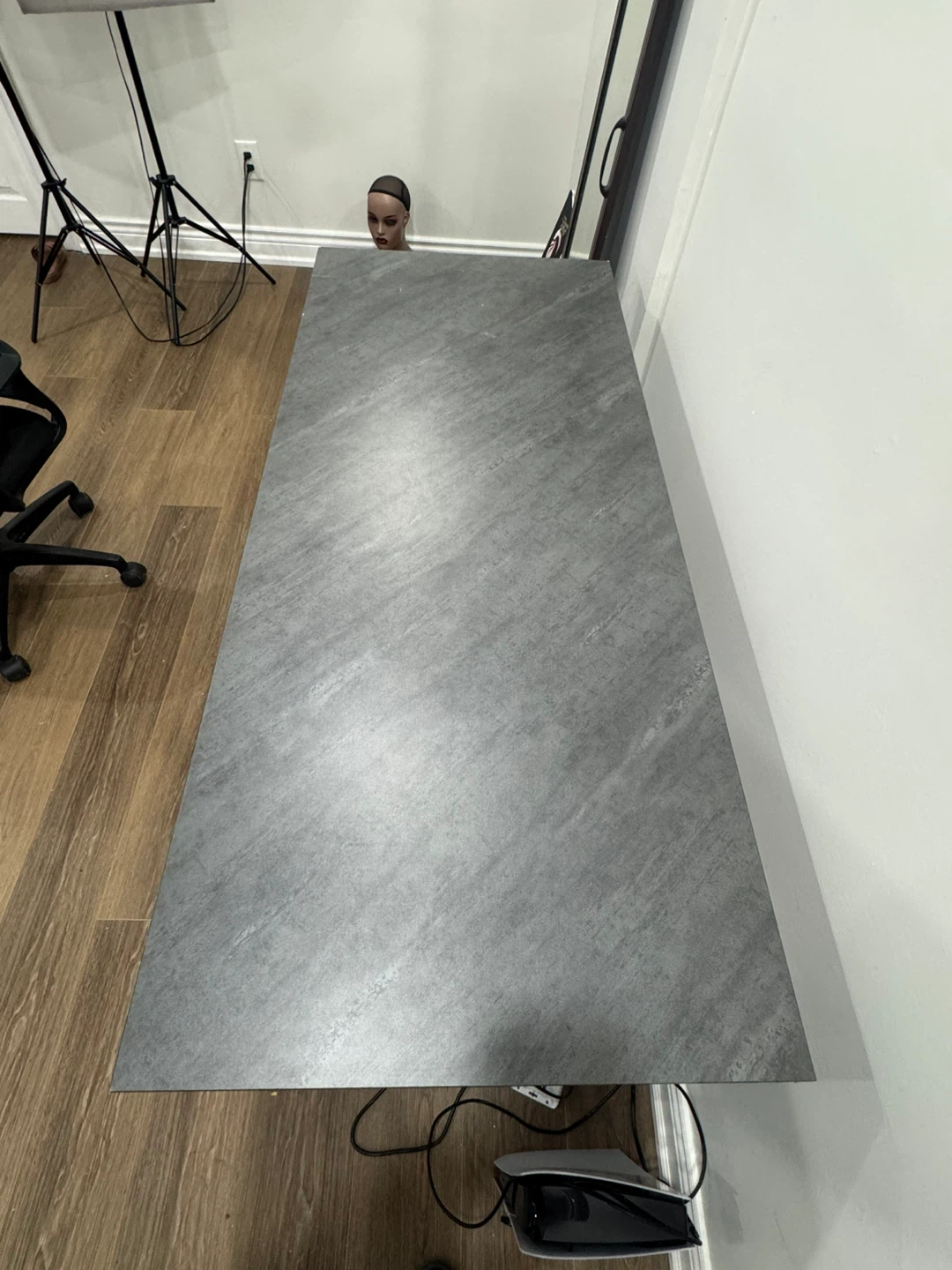 This desk has a grey marble-look laminate top and black metal legs. It's a good size for a workspace. Perfect for a home office or study area!