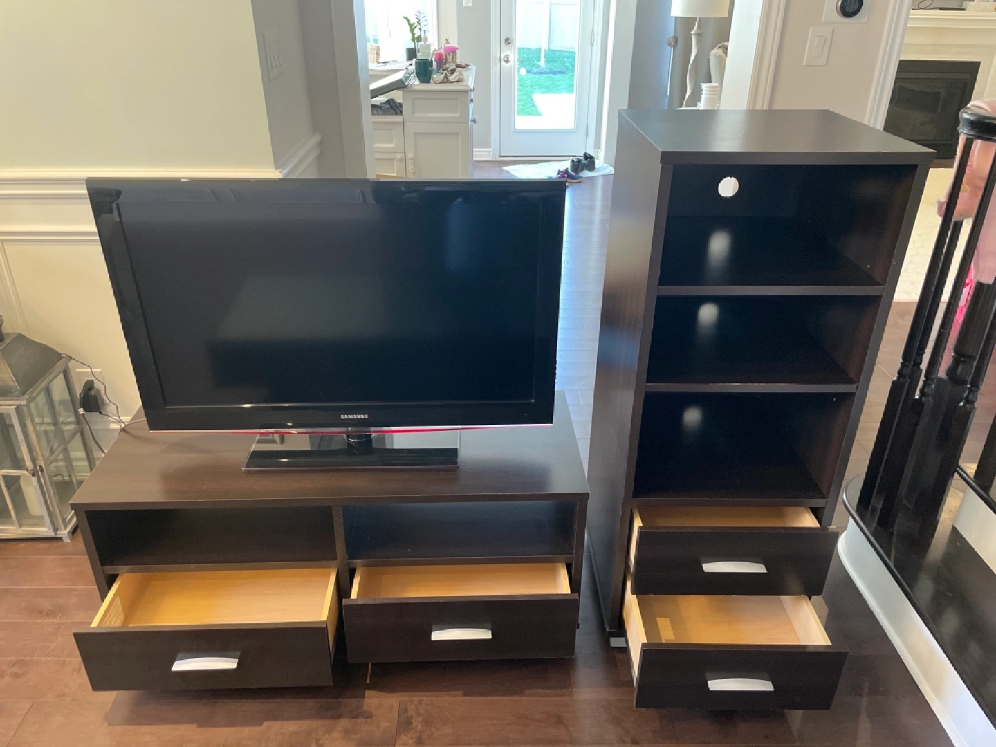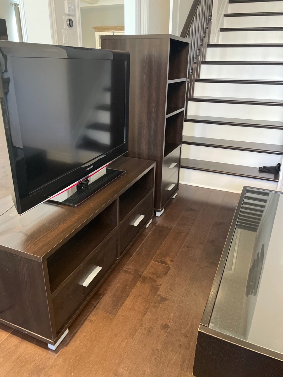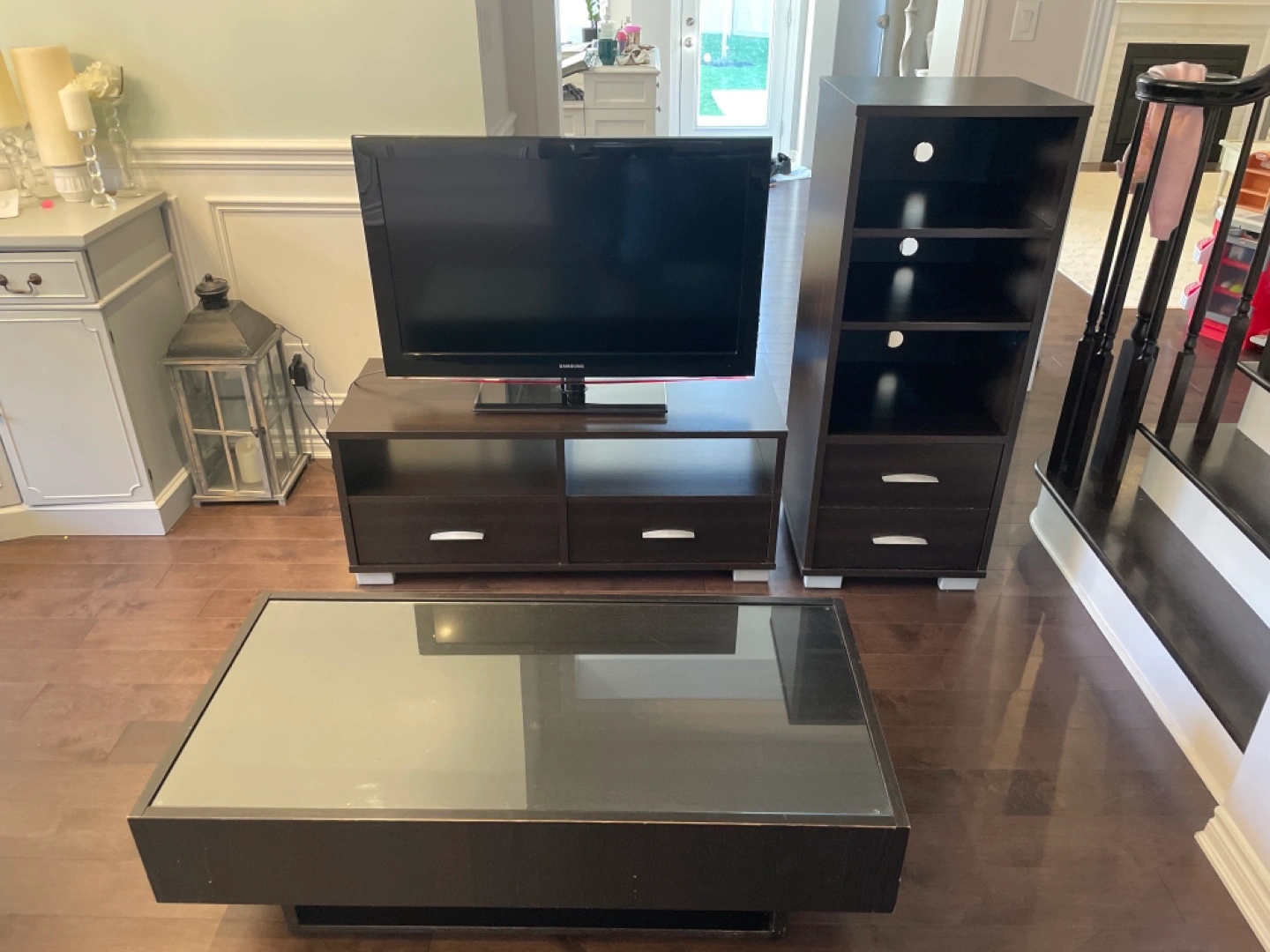 Dark brown wood entertainment set. Includes TV stand with two drawers, a matching narrow tower shelf with two shelves and two drawers, and a coffee table with two drawers with a glass top.