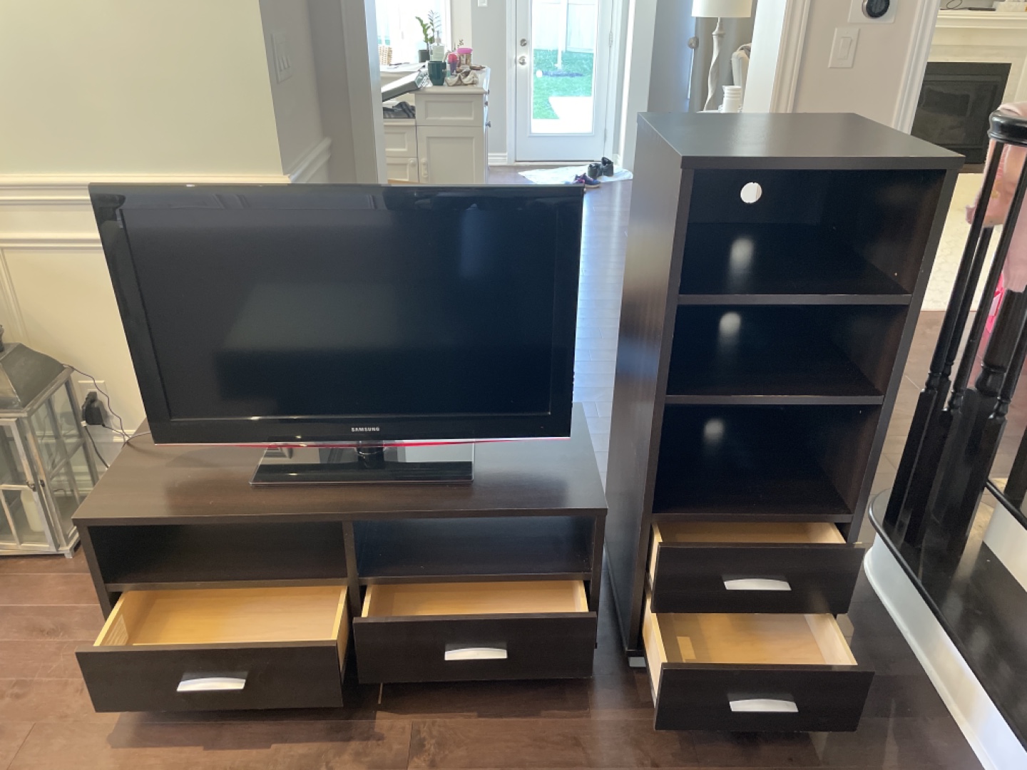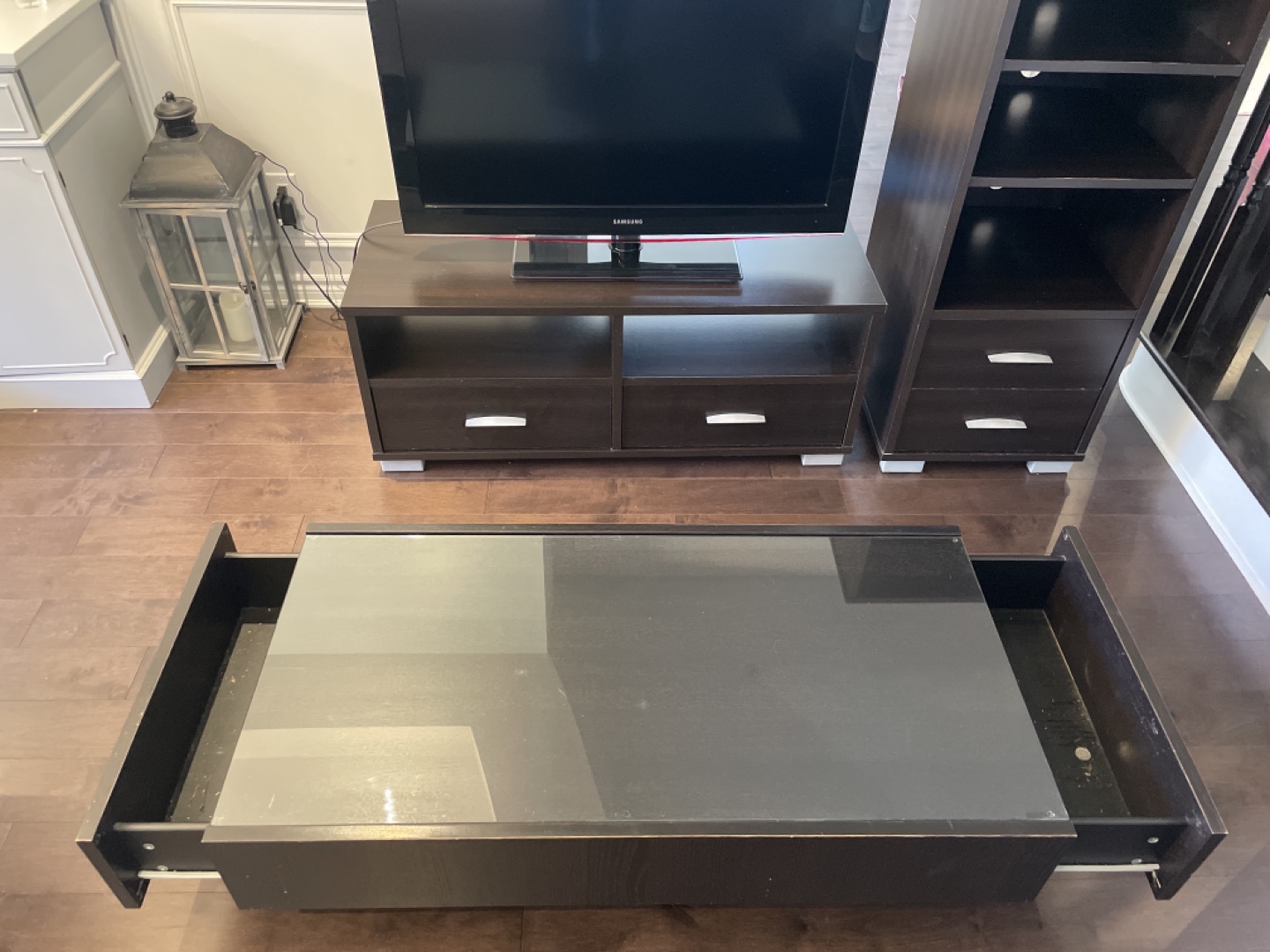 Dark brown wood entertainment set. Includes TV stand with two drawers, a matching narrow tower shelf with two shelves and two drawers, and a coffee table with two drawers with a glass top.
