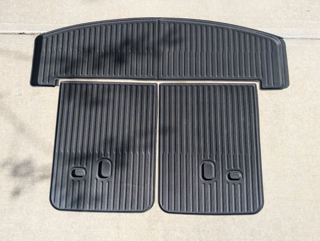 102024 Santa Fe Set of three black cargo mats, including one large curved piece and two smaller rectangular pieces. Suitable for vehicle cargo area.