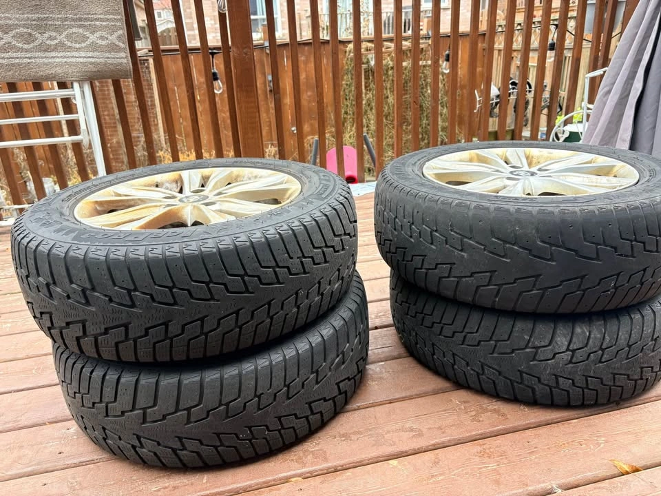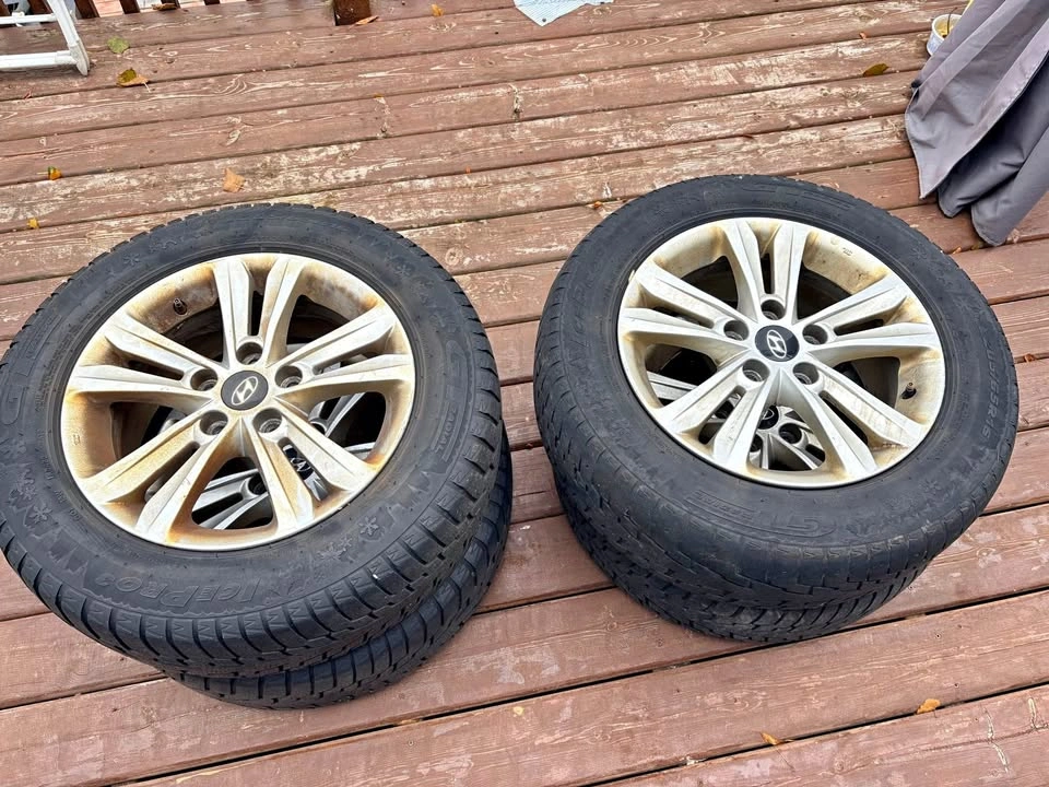 11Originally used for 2013 Hyundai Sonata. Tires In fair condition for use this winter season, Rims are genuine and just need a good cleaning.