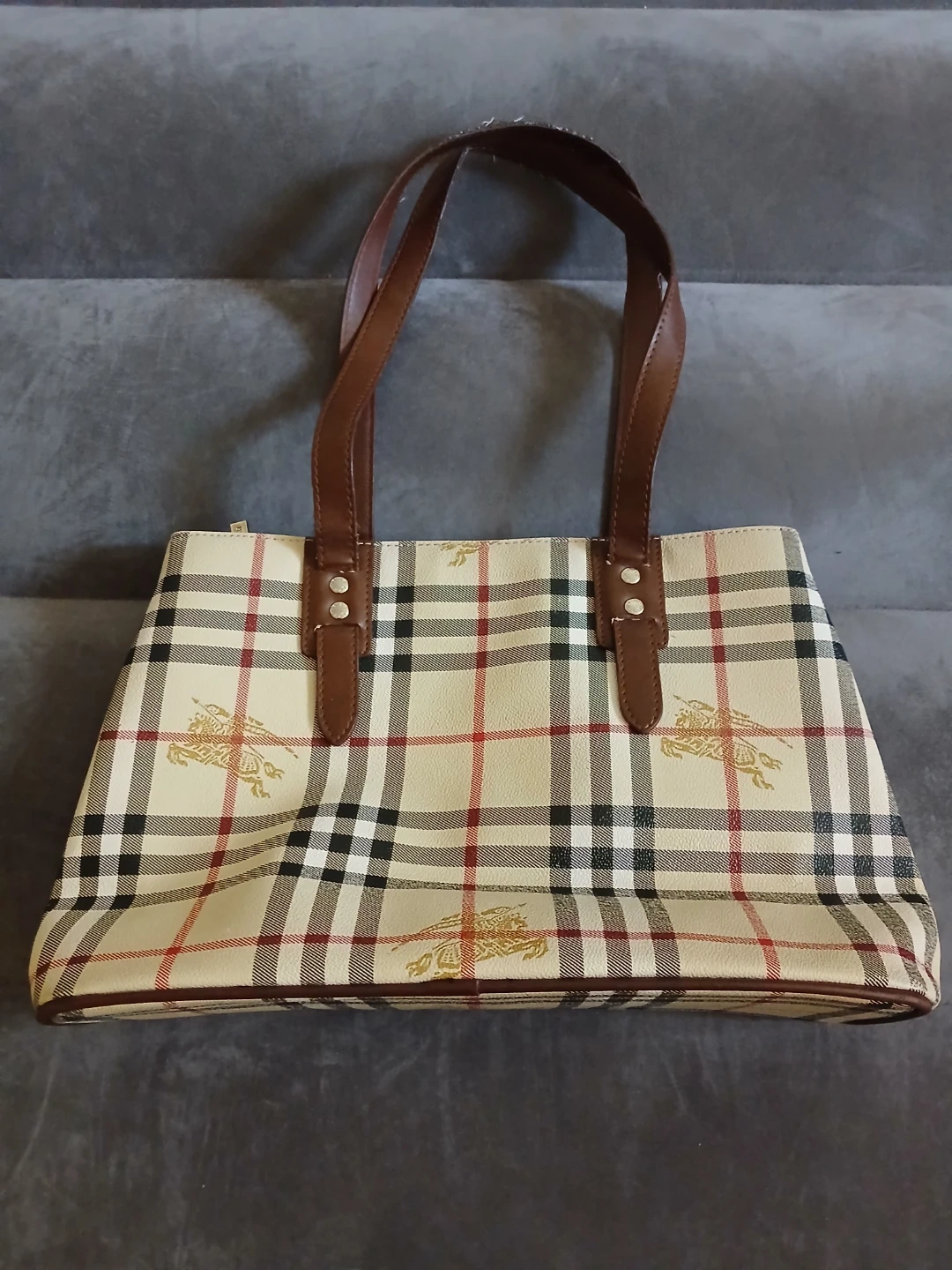 Lightly used Classic Burberry tote bag in the iconic Nova Check pattern. Features brown leather trim and handles. Includes two main compartments for organized storage. Cash only, pick up or meet up in public place.