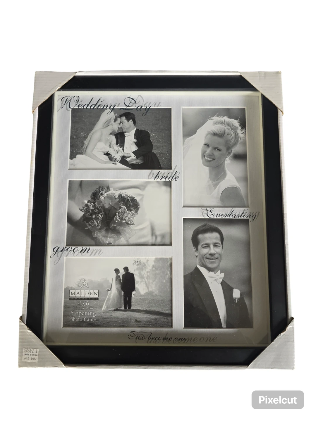 Selling a Malden International Designs 4x6 (10cm x 15cm) photo frame with 5 openings. It's perfect for displaying wedding photos or other special memories. The frame says 'Wedding Day', 'Bride', 'Groom', 'Everlasting', and 'Two become one'.