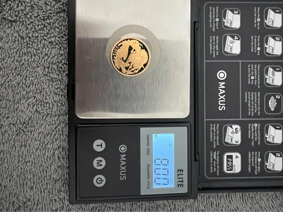 This is a beautiful 22 Karat Gold 2012 Limited Edition Mintage Round from the UK. It weighs 8 grams of 22k gold, which is 7.333 grams of pure gold. The piece comes in a beautiful wooden presentation box. It's a collector's item! Let me know if you're interested!