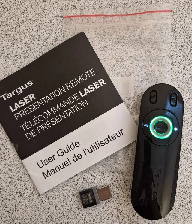 Selling Targus Laser Presentation Remote in almost new condition. This combination remote with laser pointer controls both Microsoft PowerPoint and Apple Keynote. You can control moving slides with the remote and can also point with laser light.