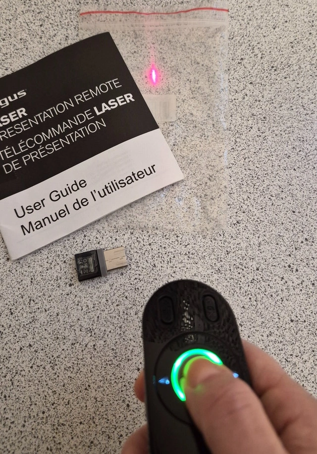 Selling Targus Laser Presentation Remote in almost new condition. This combination remote with laser pointer controls both Microsoft PowerPoint and Apple Keynote. You can control moving slides with the remote and can also point with laser light.