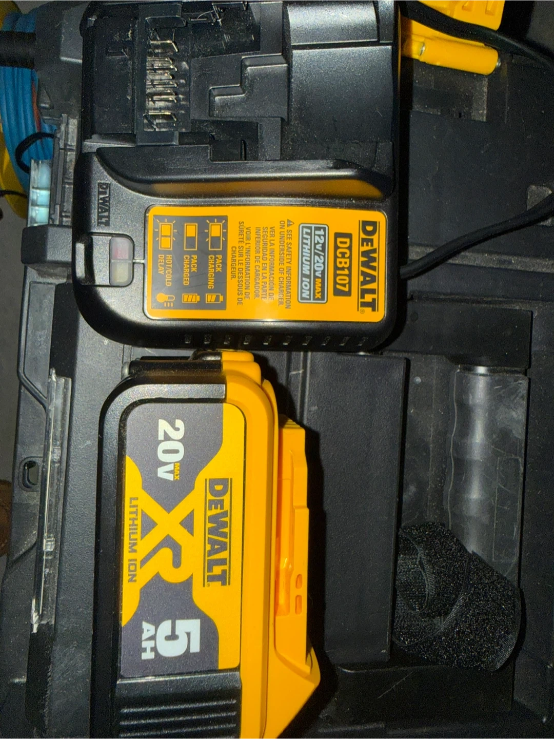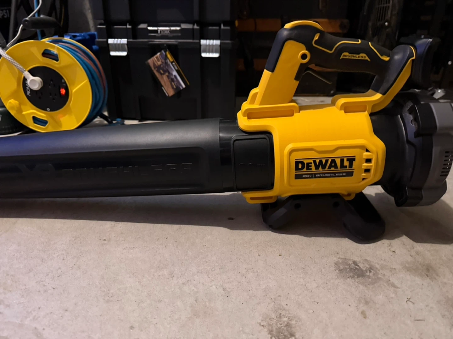 This DeWalt DCBL722 leaf blower is cordless and operates on 20V MAX Lithium Ion batteries. It's a powerful tool for yard work. Battery and charger are included