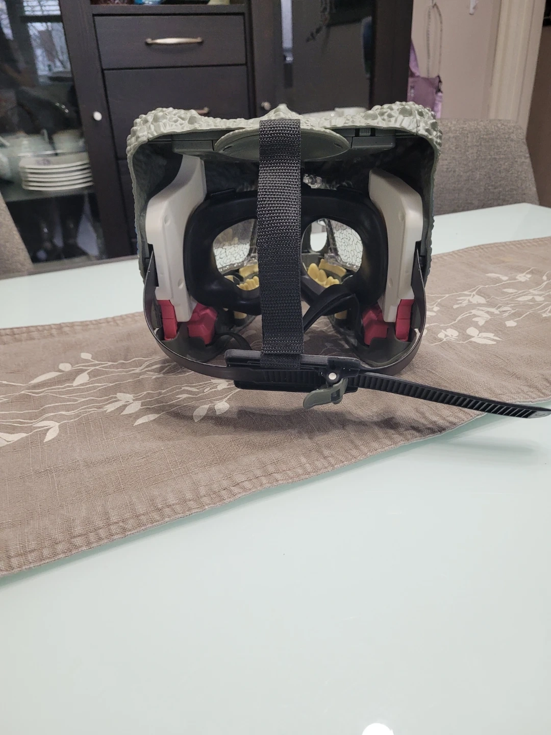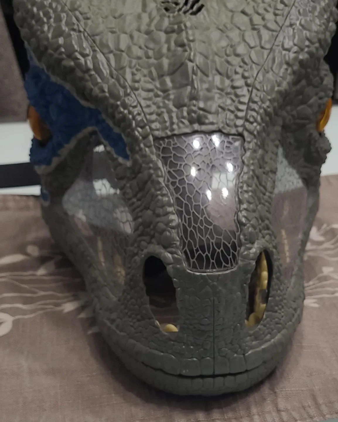This is a blue Velociraptor dinosaur mask. It features sound and a textured design. It's secured with an adjustable strap for a comfortable fit. This mask is great for imaginative play and halloween