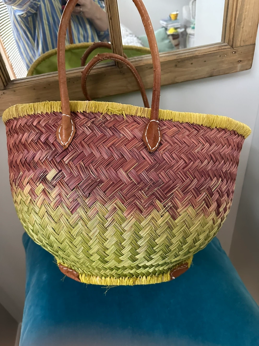 This woven straw tote bag has a colourful gradient design. It features comfortable leather handles and a bright green fabric lining. Perfect for trips to the market or a day at the beach!