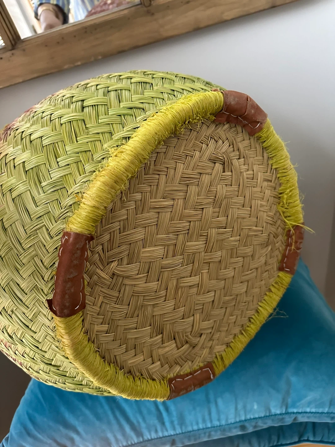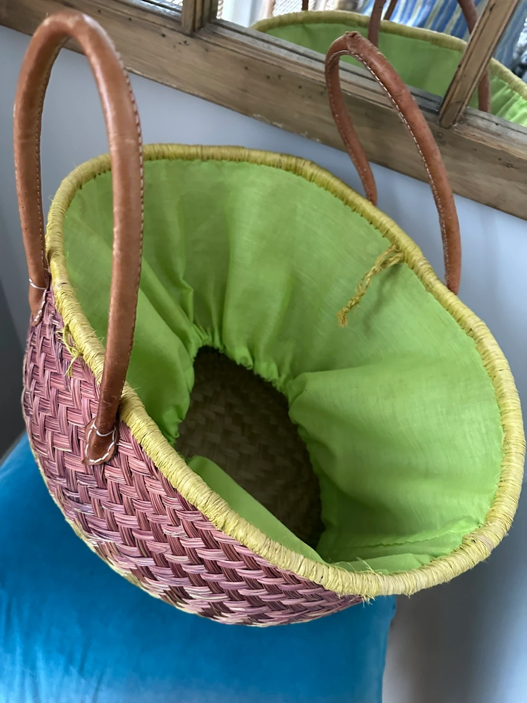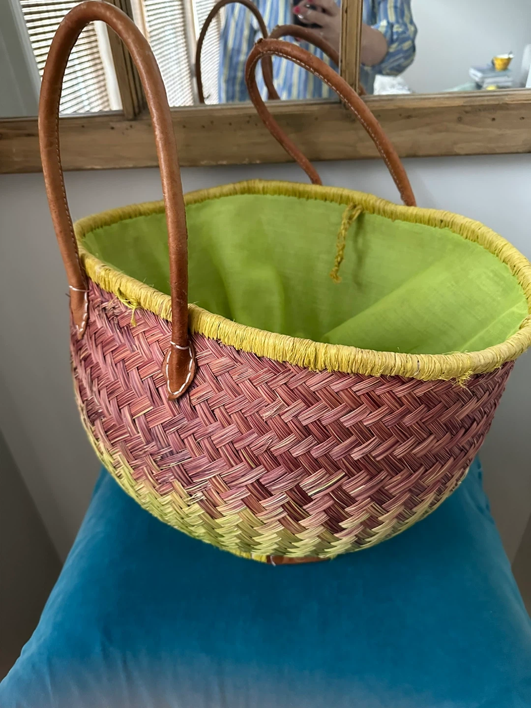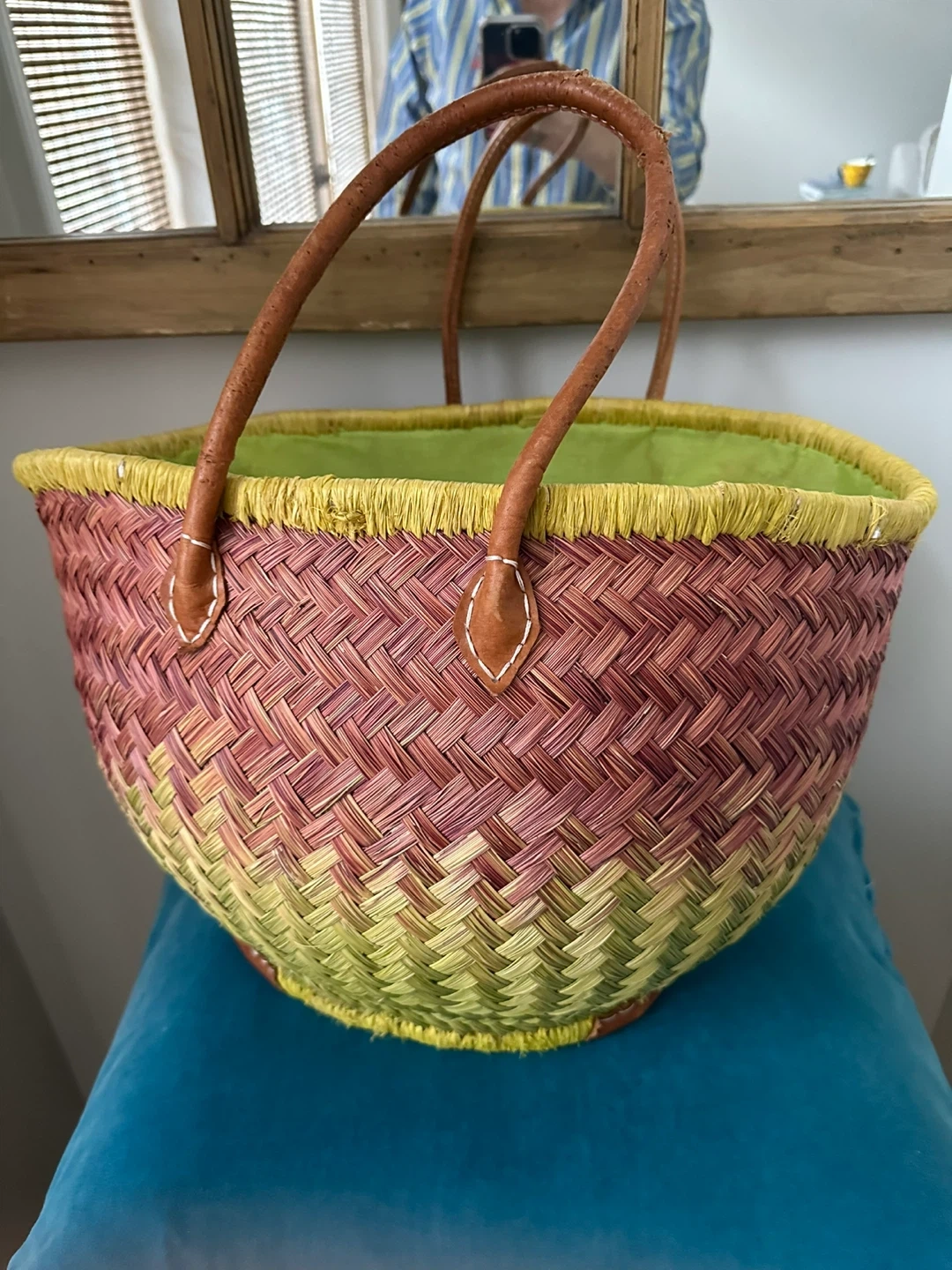 This woven straw tote bag has a colourful gradient design. It features comfortable leather handles and a bright green fabric lining. Perfect for trips to the market or a day at the beach!