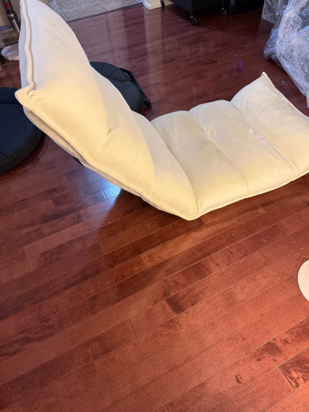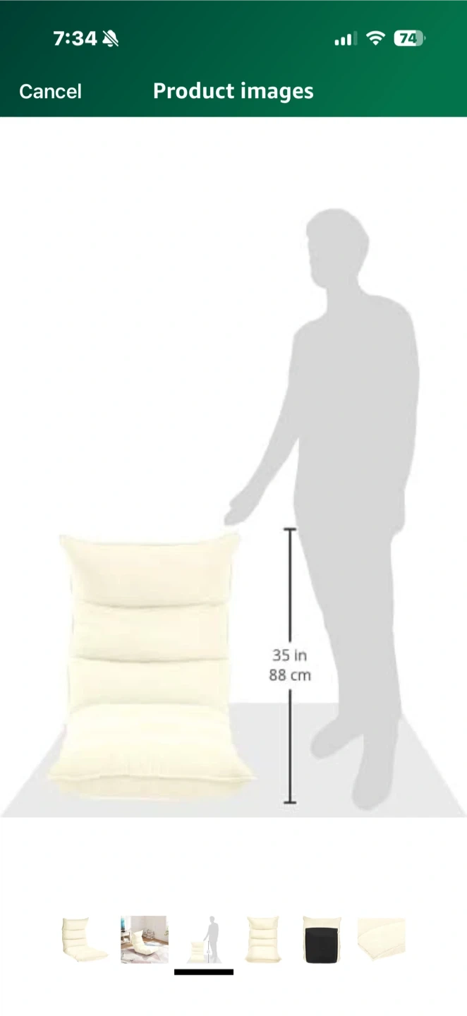 This adjustable floor chair is perfect for adding extra seating to any room. It's in good condition and ready for a new home for reading, watching tv or playing games. The chair is cream-coloured and measures approximately 35 inches (88 cm) in height. Total length is 53 inches. Seat is made of memory foam.