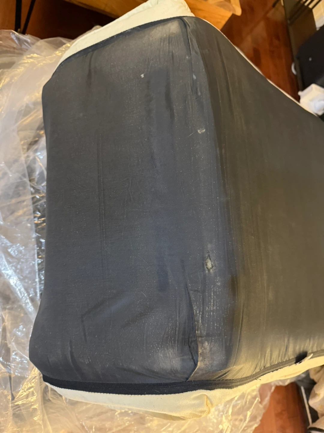 Fabric is suede-like and is super soft. Theres no stains or rips as we always used a blanket on top. There is some wear on the bottom (where the hinges are) - see last photo.