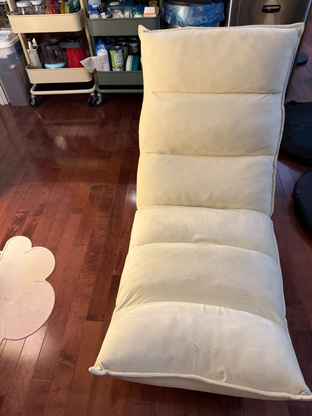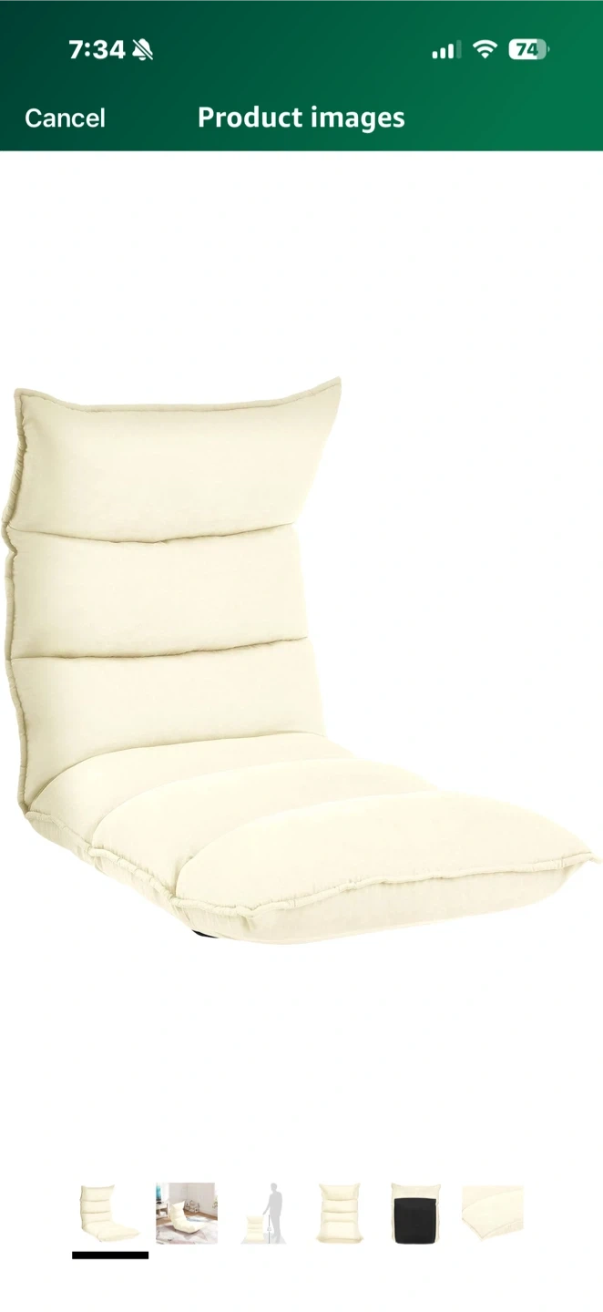 This adjustable floor chair is perfect for adding extra seating to any room. It's in good condition and ready for a new home for reading, watching tv or playing games. The chair is cream-coloured and measures approximately 35 inches (88 cm) in height. Total length is 53 inches. Seat is made of memory foam.