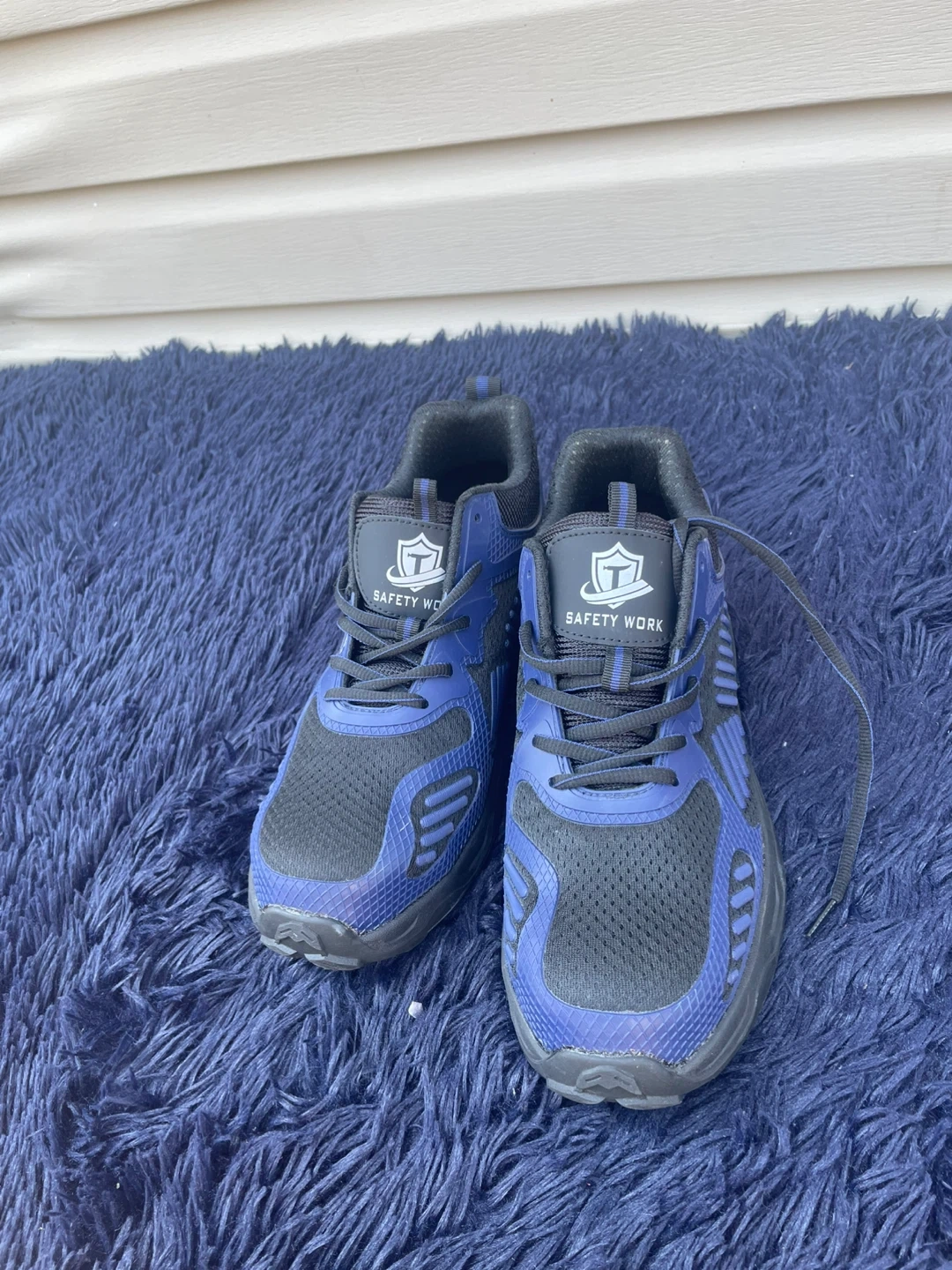 These blue and black safety work shoes feature a breathable mesh upper. They're designed for durability and comfort on the job.