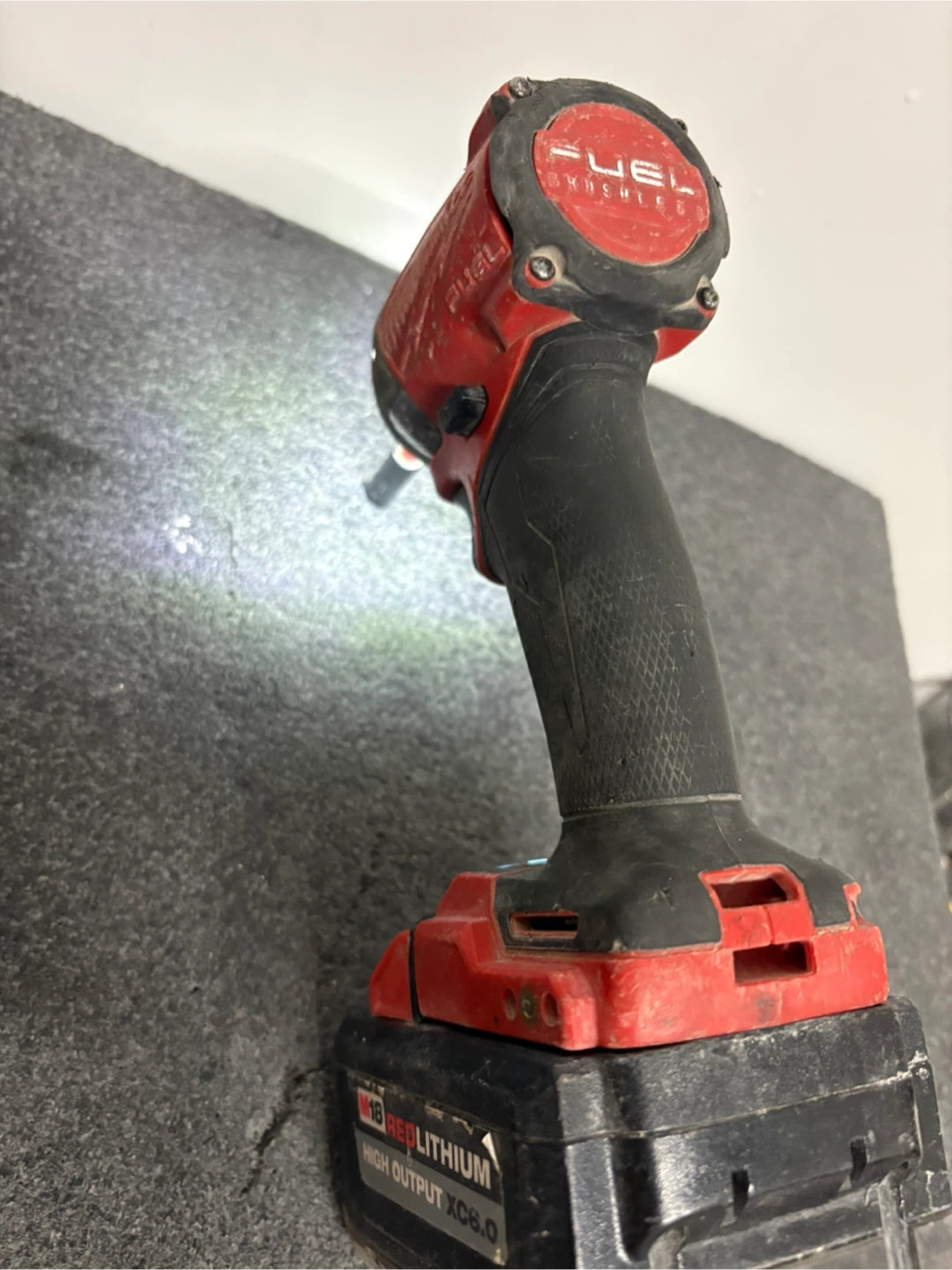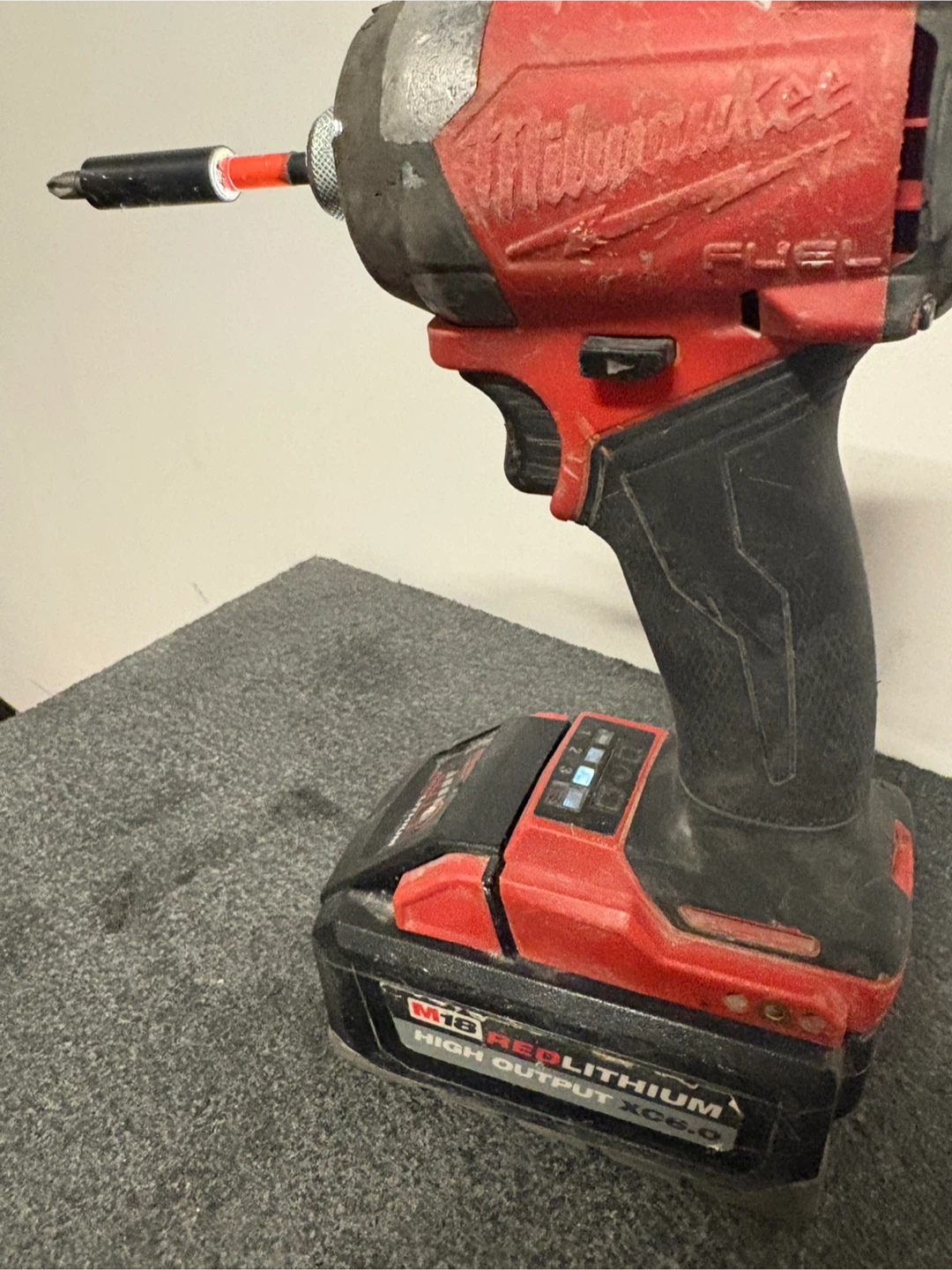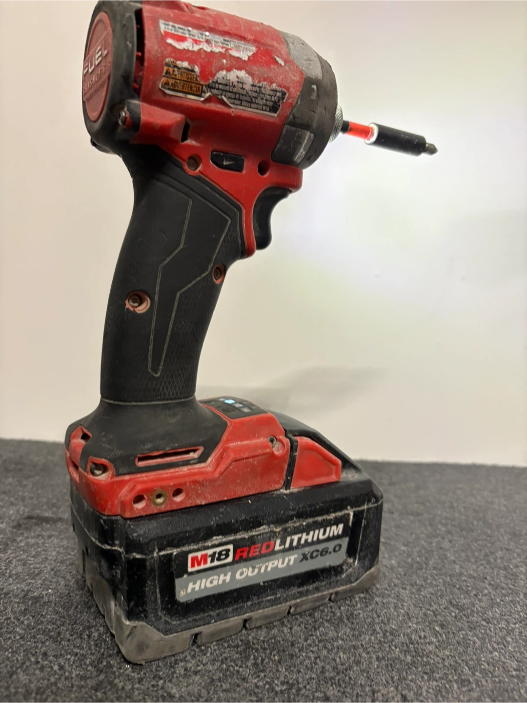 This is a Milwaukee M18 FUEL impact wrench with a high output XC6.0 battery. It's designed for heavy-duty use. Includes a screwdriver bit.