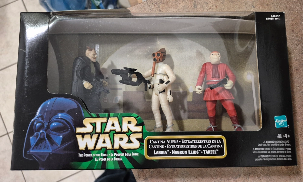 Vintage Star Wars Episode I action figure 3-pack. Features Labria, Nabrun Leid, and Takeel. Figures in original packaging. Collectible item for Star Wars fans.