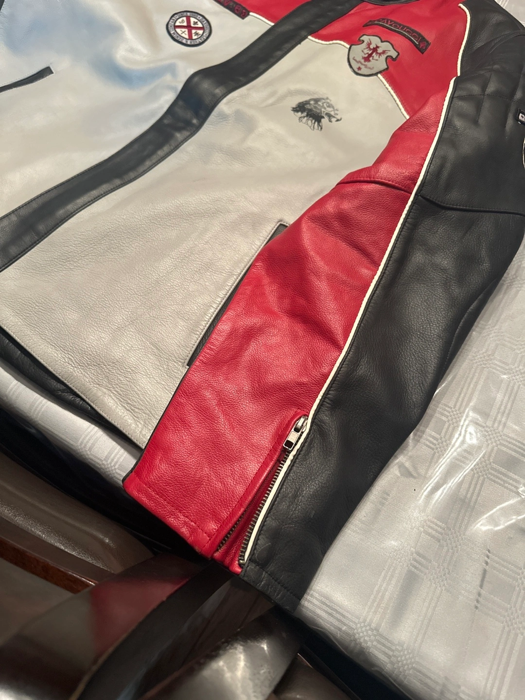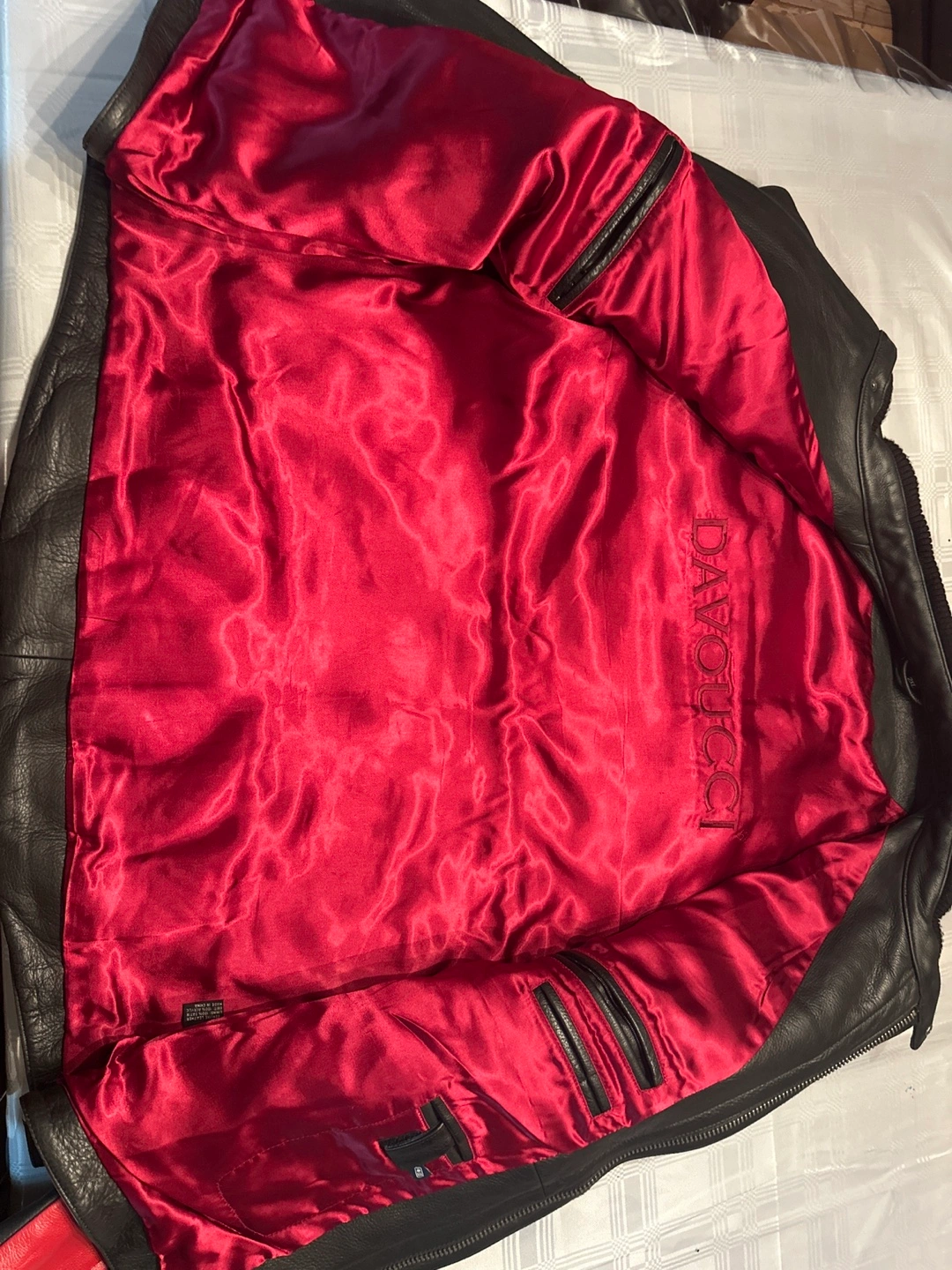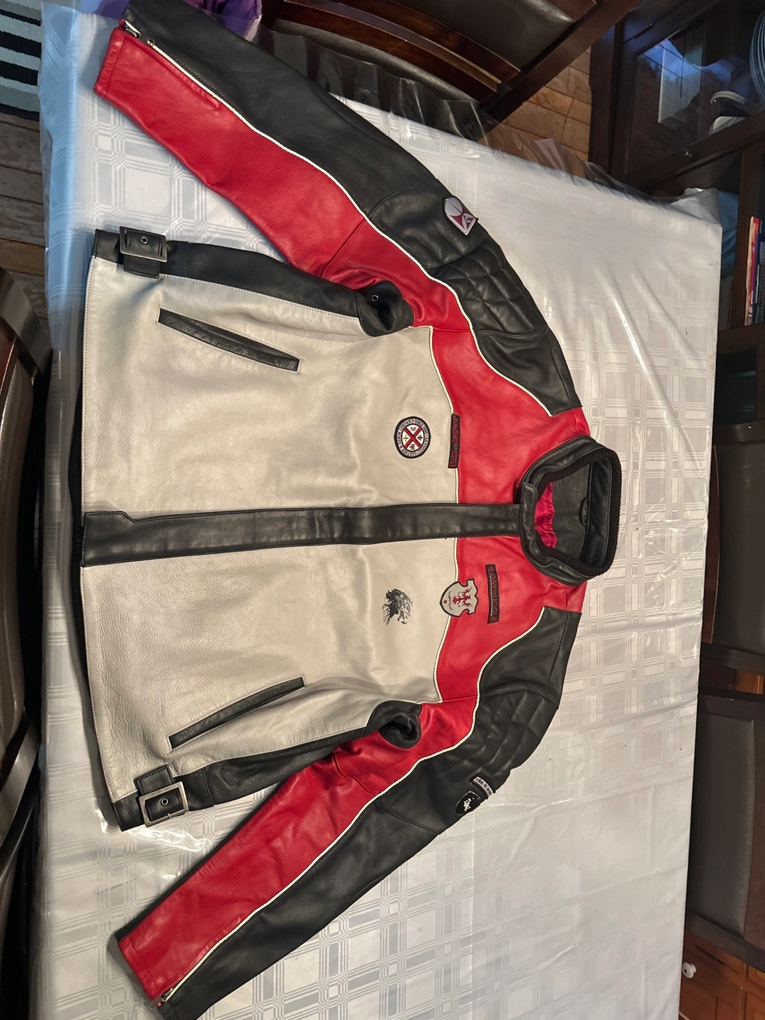 Men's leather motorcycle jacket. Red, black and grey colour scheme. Multiple pockets. Great condition. Over 15years old super mint condition vintage