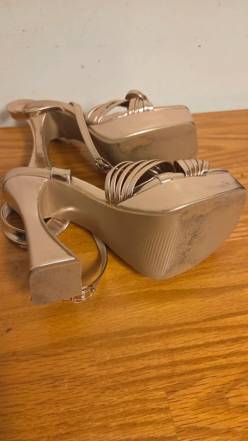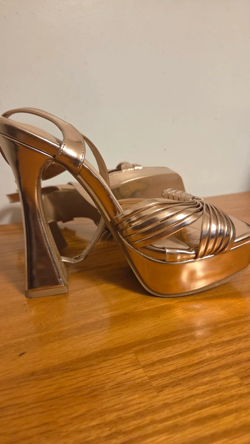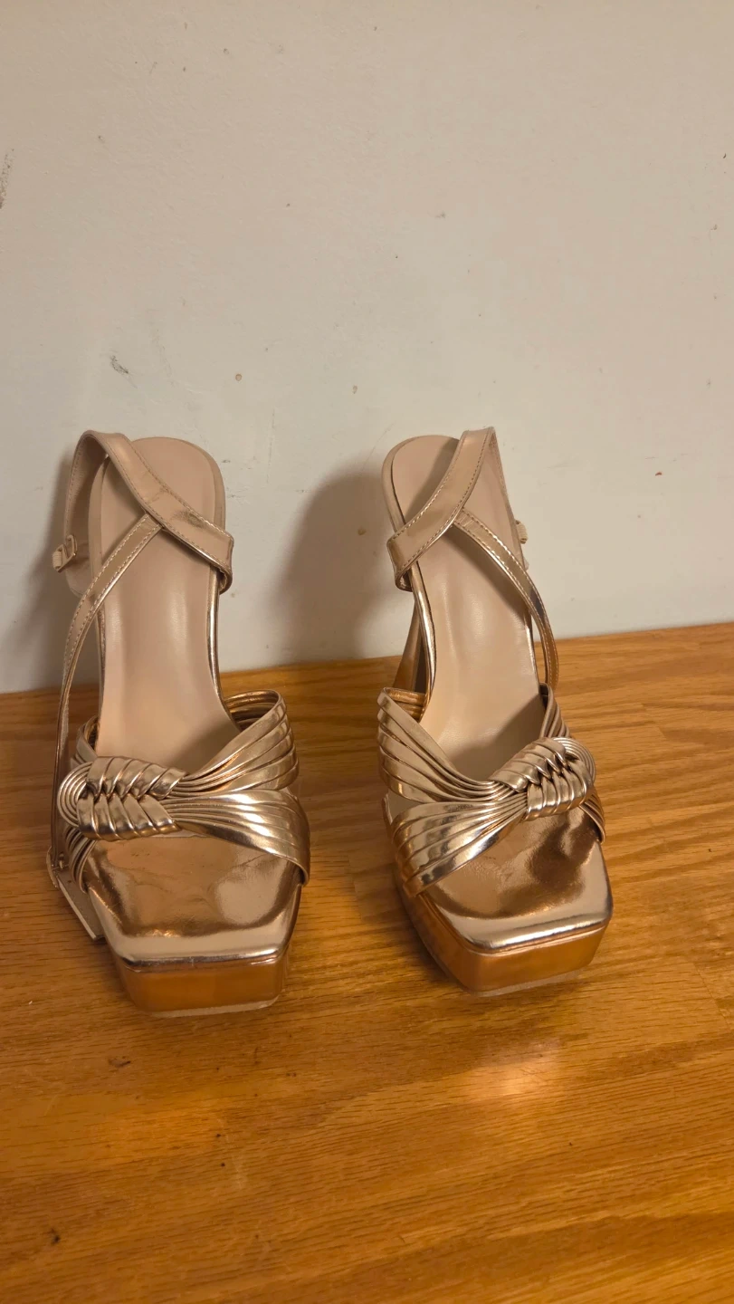 Strappy rose gold platform heels with a twisted knot detail on the vamp. These have an ankle strap and a chunky block heel. Great for a night out or special occasion!