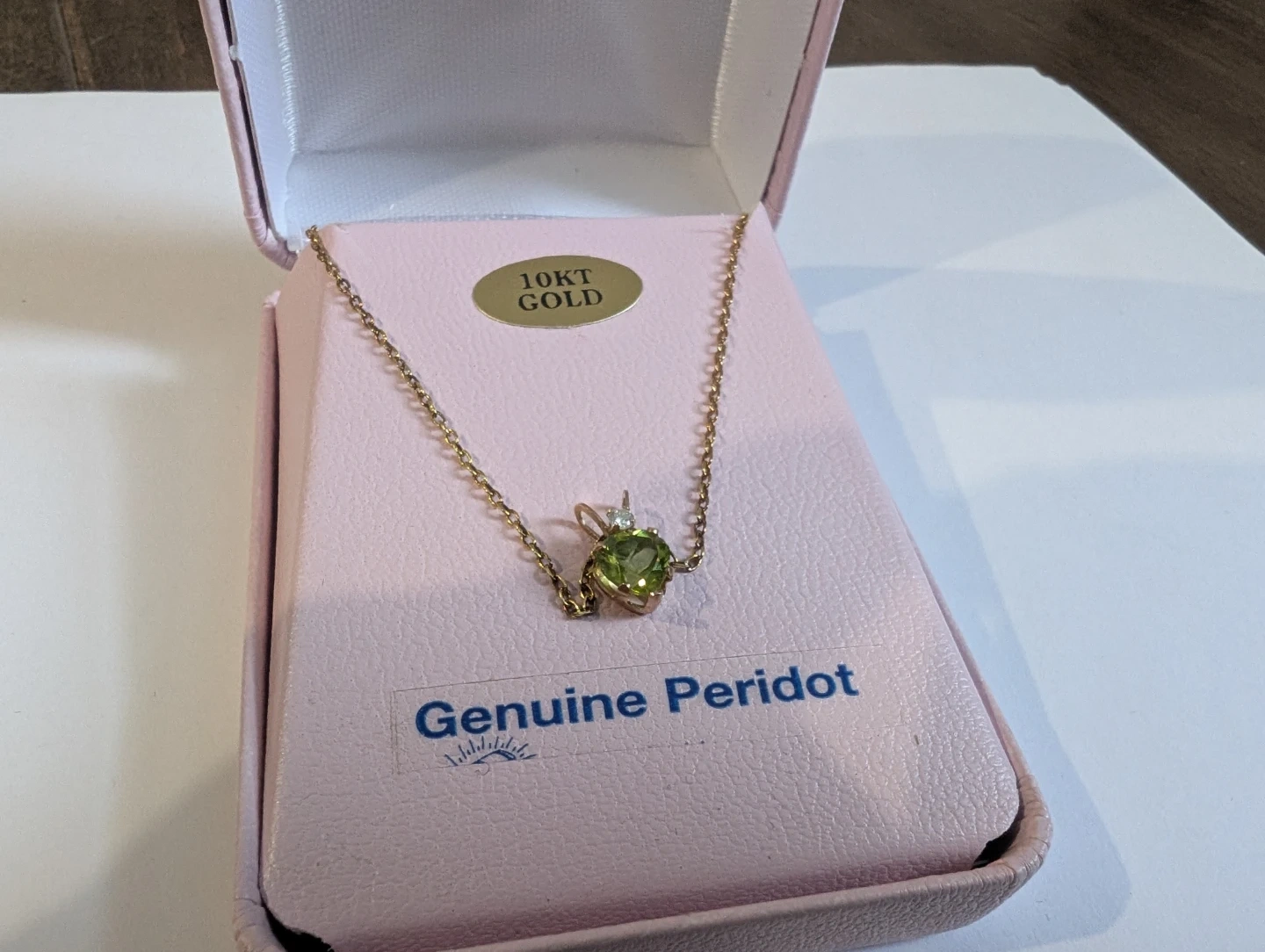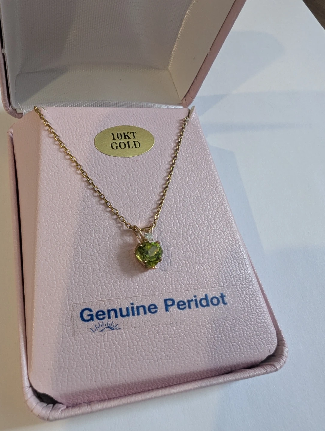 Brand new 10kt yellow gold natural peridot gemstone necklace and pendant for sale. Natural peridot gem stone 0.65ct, gold plated sterling silver chain, August birthstone, $150 FIRM.
