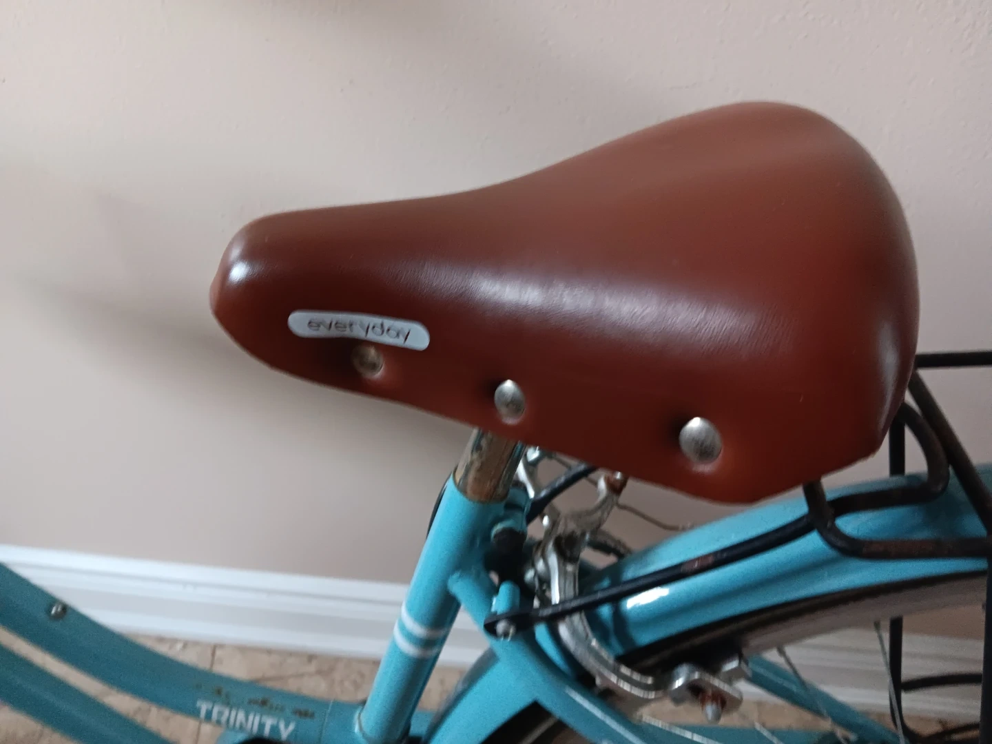 Women's hybrid bike with a front basket and rear rack. Features a comfortable brown saddle and handlebars. It's blue with silver wheels. Great for city commutes!