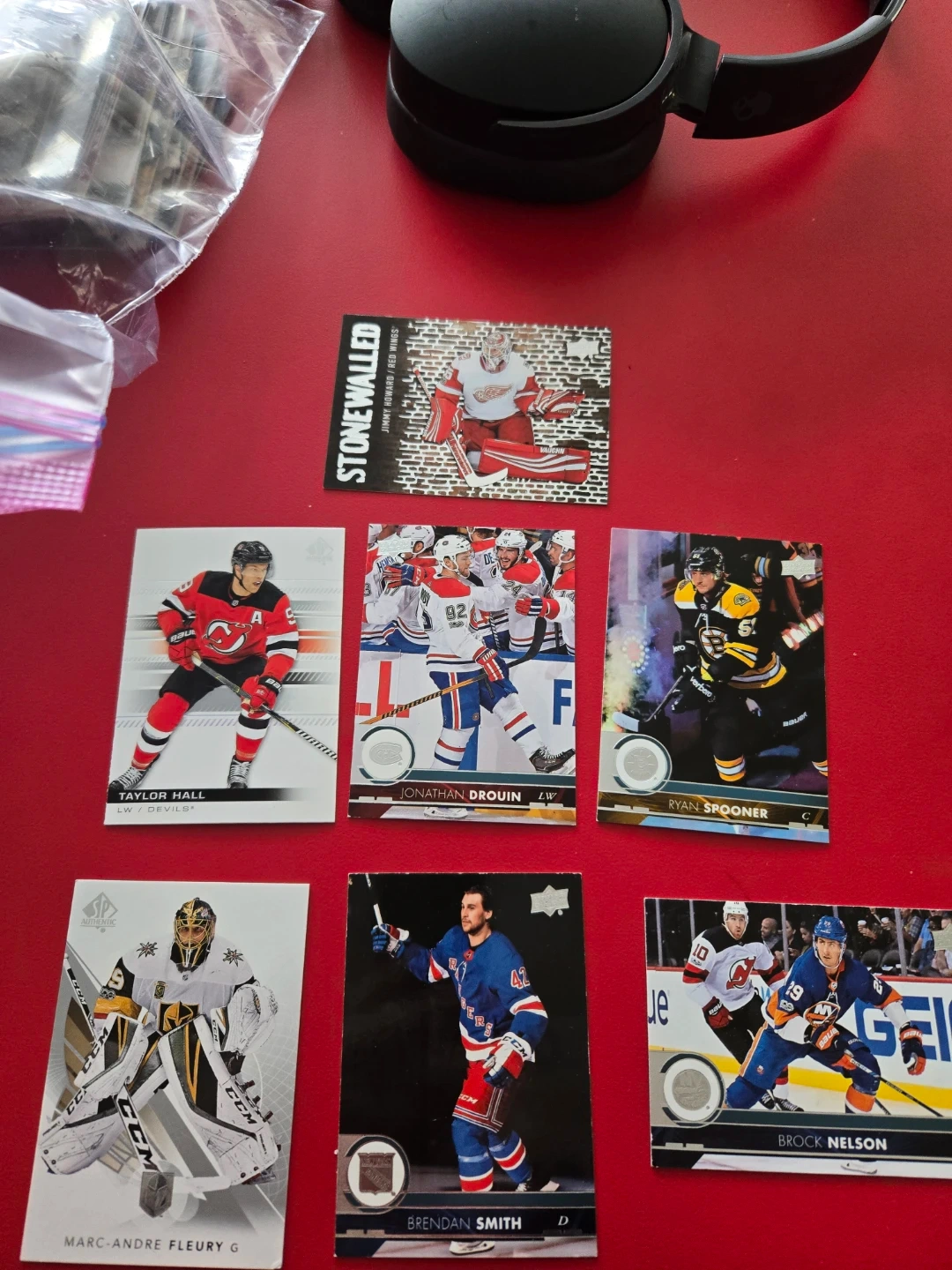 This lot includes hockey cards featuring Taylor Hall, Jonathan Drouin, Ryan Spooner, Jimmy Howard (Stonewalled), Marc-Andre Fleury, Brendan Smith, and Brock Nelson. Great for any hockey fan!