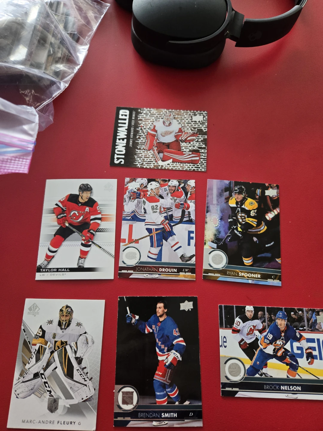 This lot includes hockey cards featuring Taylor Hall, Jonathan Drouin, Ryan Spooner, Jimmy Howard (Stonewalled), Marc-Andre Fleury, Brendan Smith, and Brock Nelson. Great for any hockey fan!