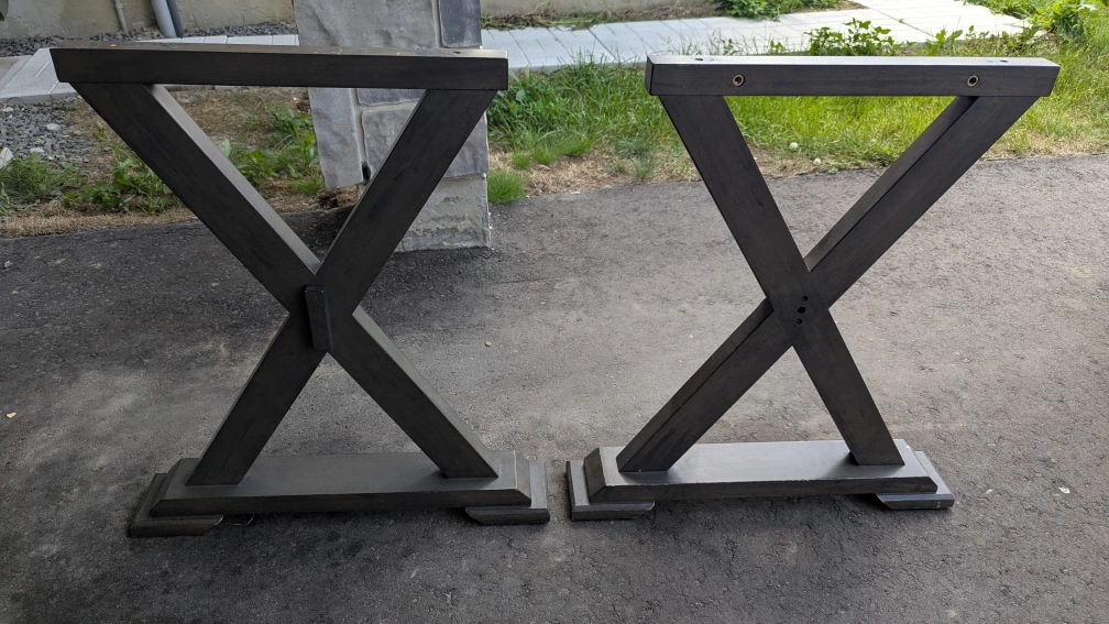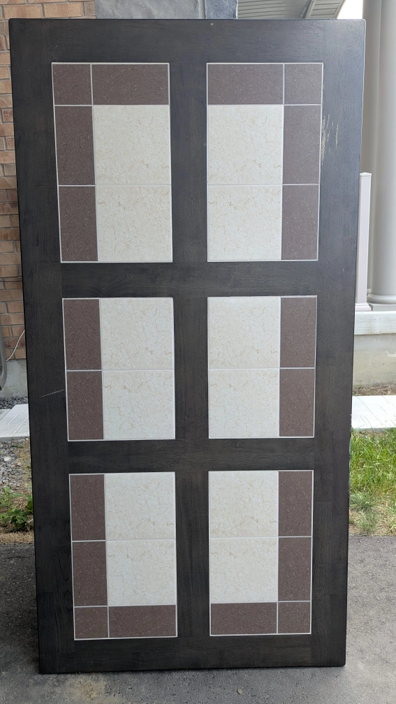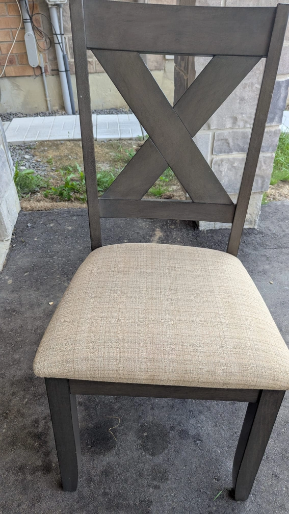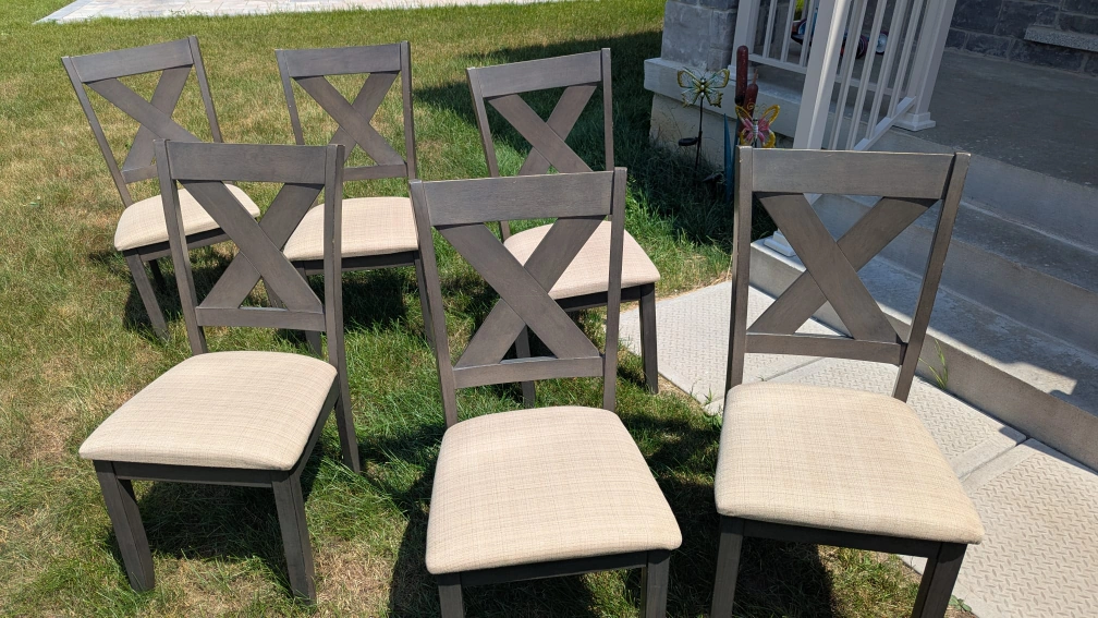 Selling a dining table with six chairs. The chairs have a dark grey wood frame with a beige upholstered seat. The table has a dark grey wood frame with a tiled top. Great for any dining room!