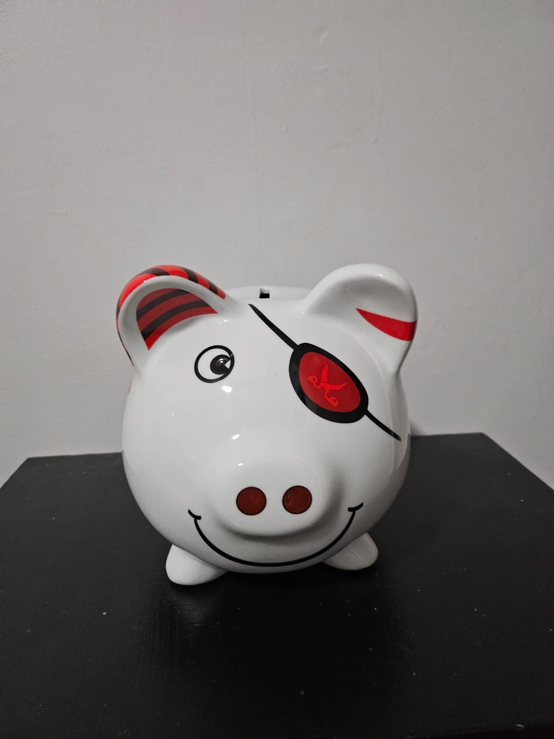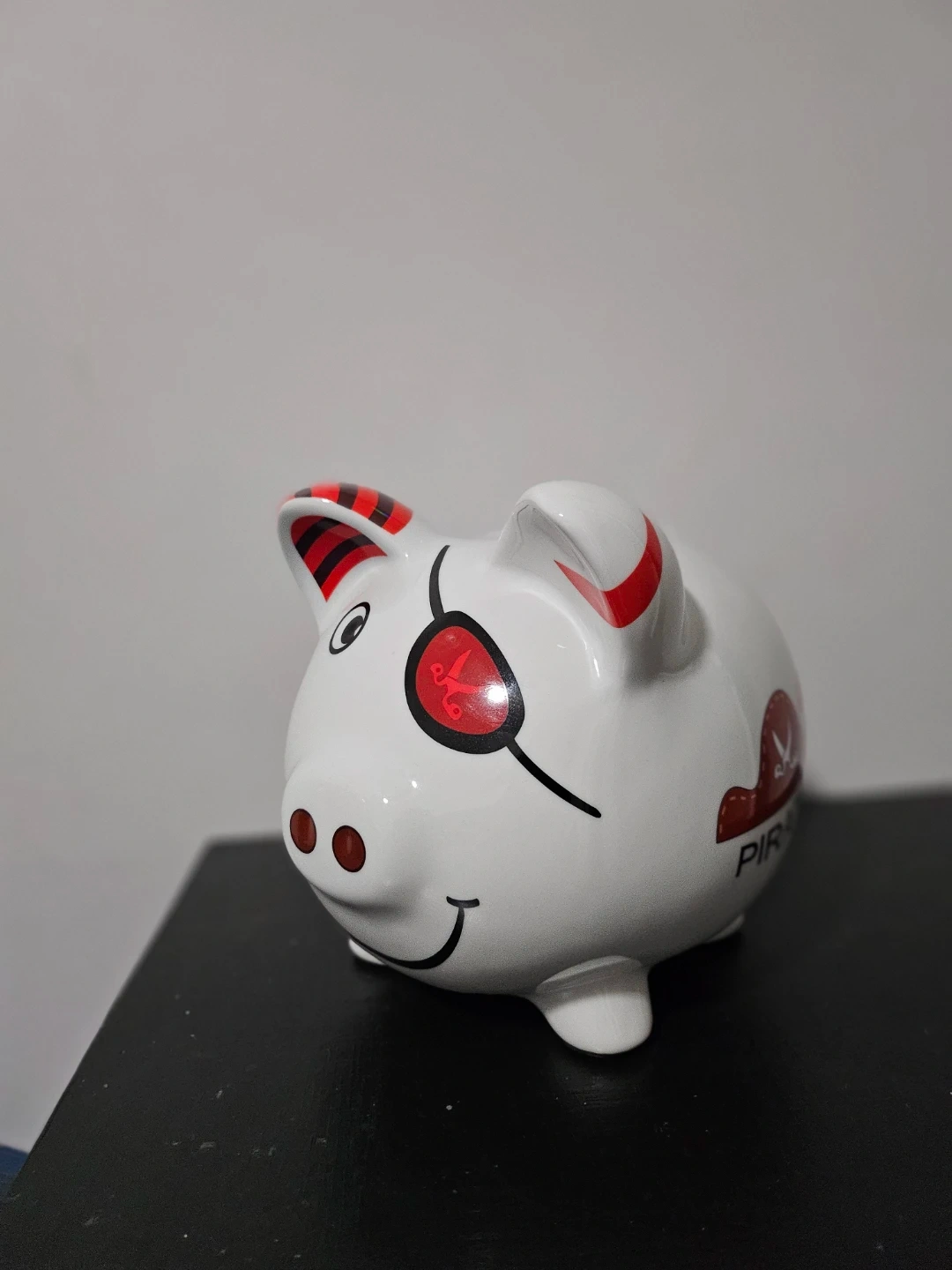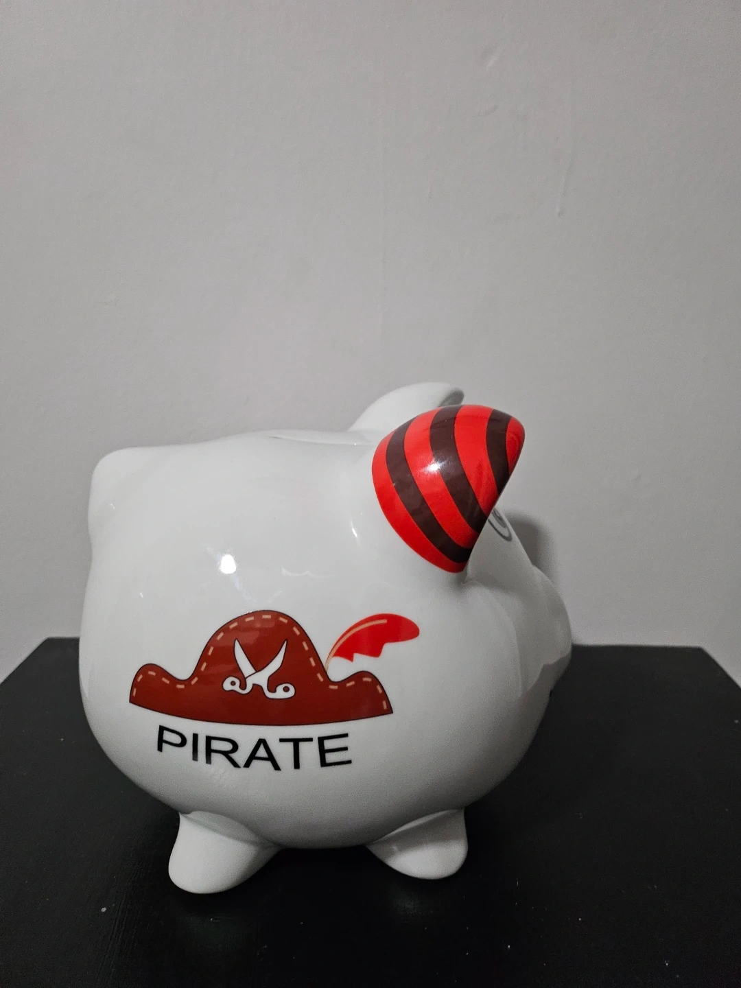 Cute white ceramic piggy bank decorated with a pirate theme. It has a red and black striped ear and an eyepatch with scissors detail. The word "PIRATE" is printed on the side with a pirate hat graphic. This fun coin bank is perfect for kids learning to save!