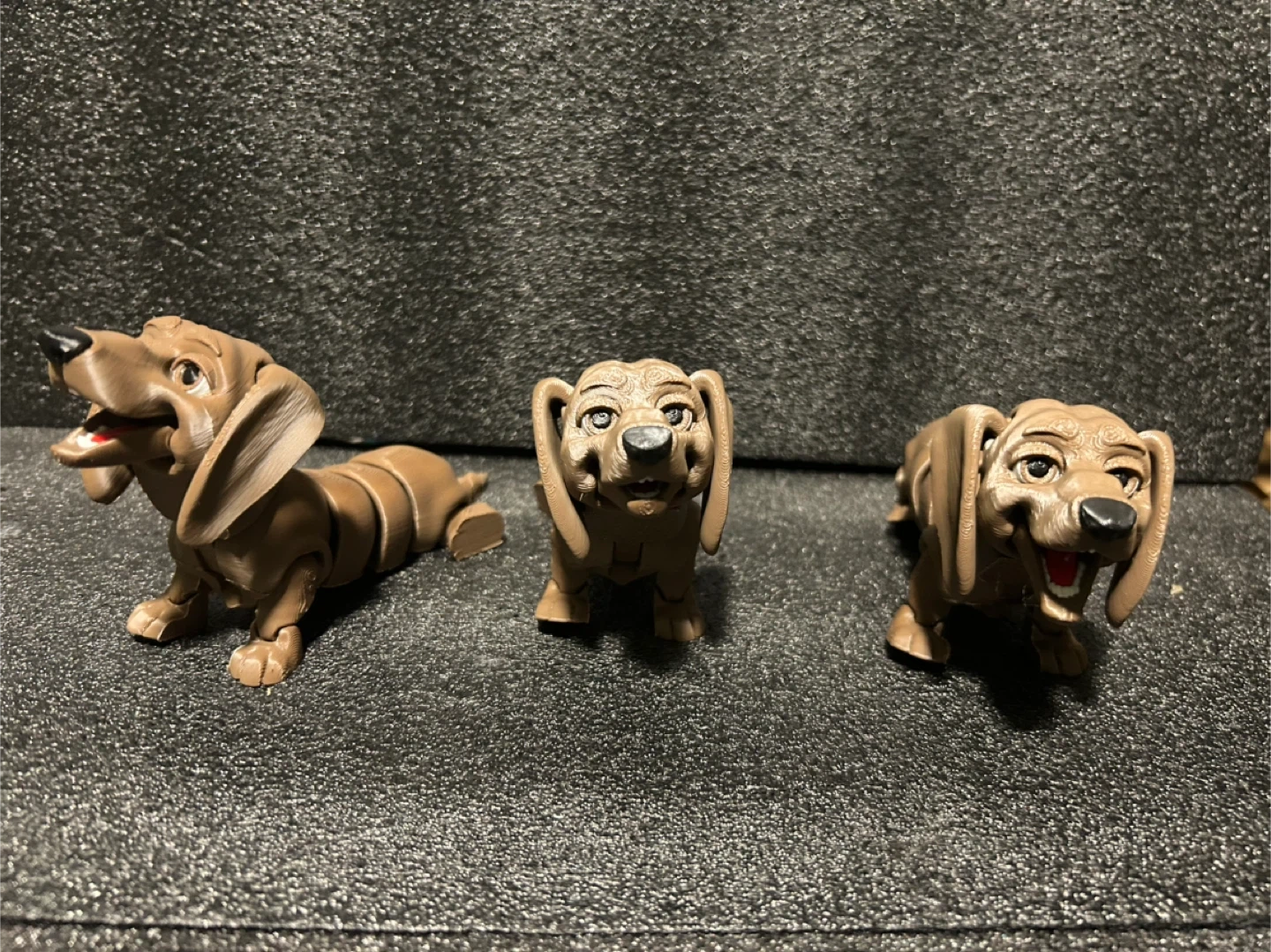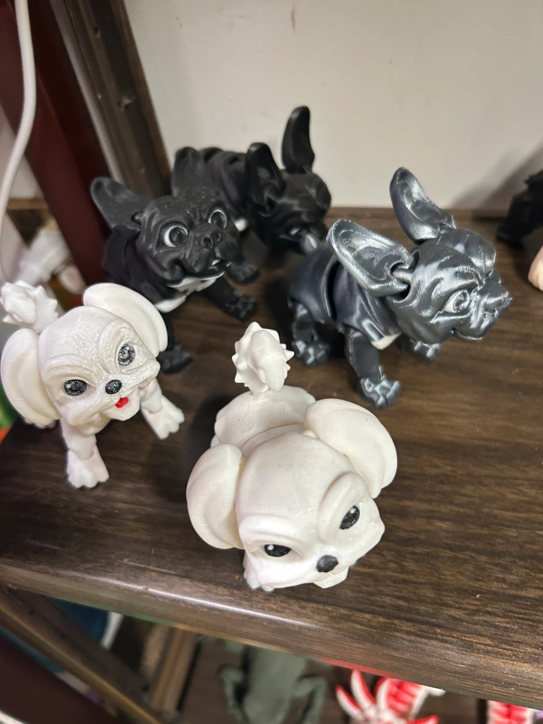 This is a collection of 3D printed figurines, including French Bulldogs, crabs in hats, deer with flowers, horses, and dachshunds. They're perfect for display or as unique decorative pieces.
