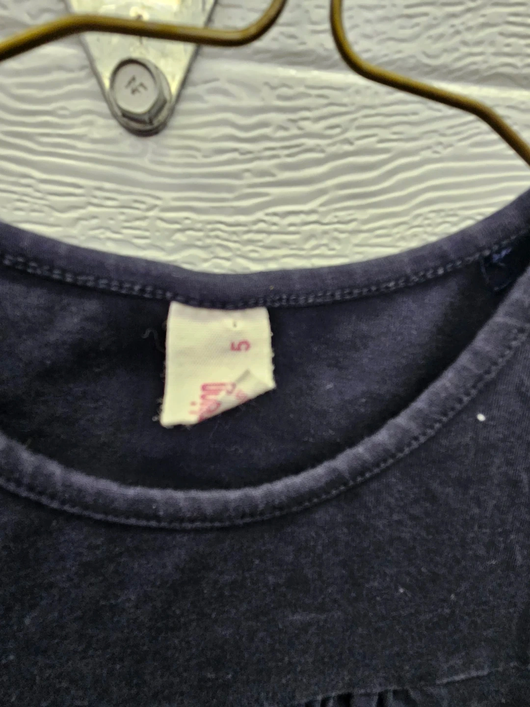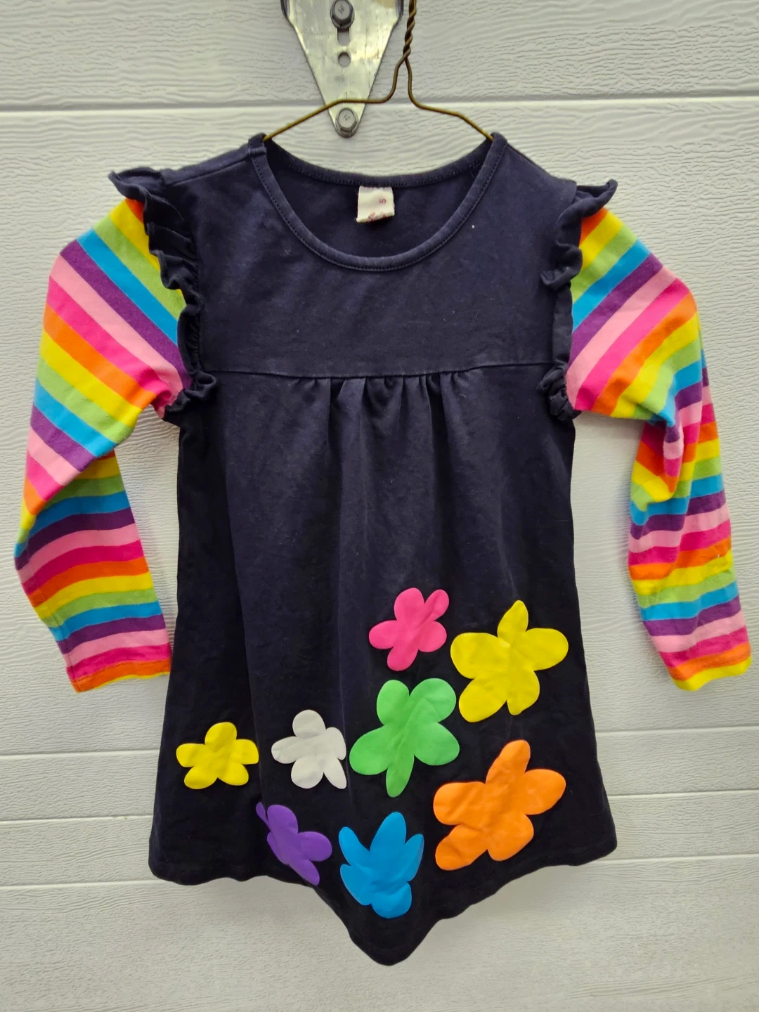 This navy long-sleeved t-shirt features colourful rainbow stripes on the sleeves and embroidered flowers on the front. It's a size 5. Perfect for playtime!