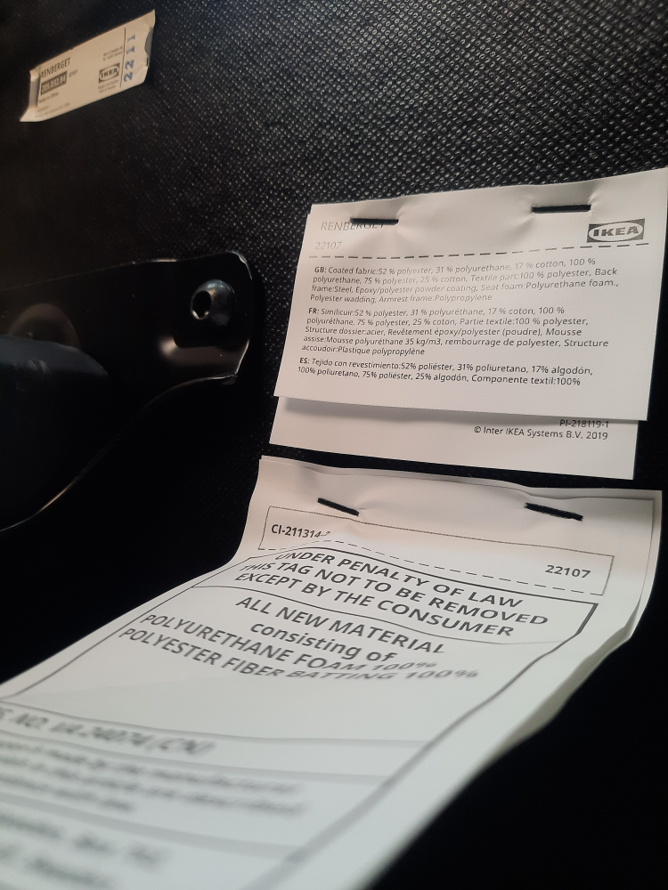 It's in great shape and super comfy for working from home or gaming. The chair features a coated fabric consisting of 53% polyester, 31% polyurethane, and 16% cotton. The back frame sheet is made from steel with epoxy/polyester powder coating, and the seat foam is polyurethane foam and polyester wadding.