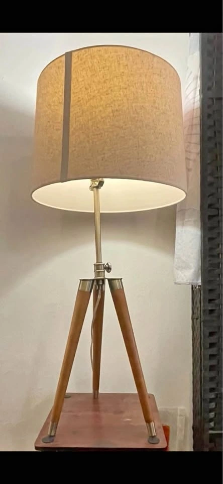 Wooden tripod lamp with a fabric shade and metal accents. Cord and plug included. Lightbulb included but not tested. Pickup in Woodside. Cash only.
