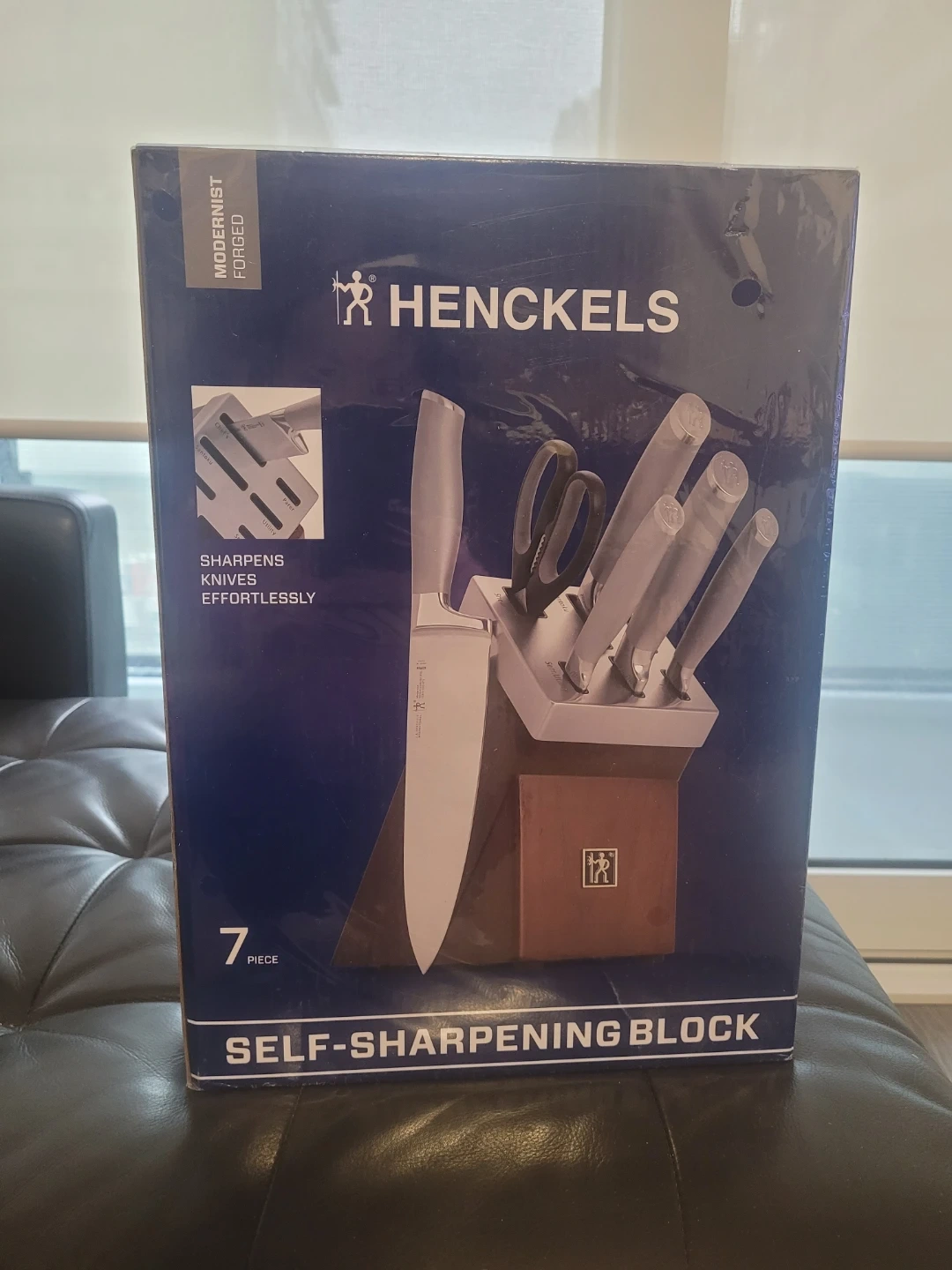 Selling a Henckels Modernist Forged 7-piece knife set with a self-sharpening block! It's a great set for any kitchen and the self-sharpening block makes maintaining your knives super easy. The set includes a variety of knives and a pair of scissors, all neatly organized in the block